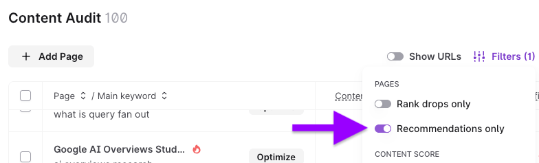 If you’re seeing a lot of pages here and don’t know where to start, try filtering for “Recommendations only”. This narrows the list down to pages that have low Content Scores and high ranking potential.