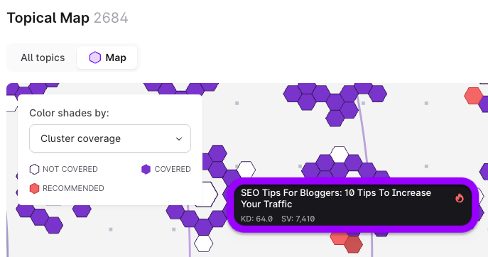 For example, we have a strong cluster of content about SEO for bloggers. But I can see in the Topical Map that we missed the topic of how to increase blog traffic: