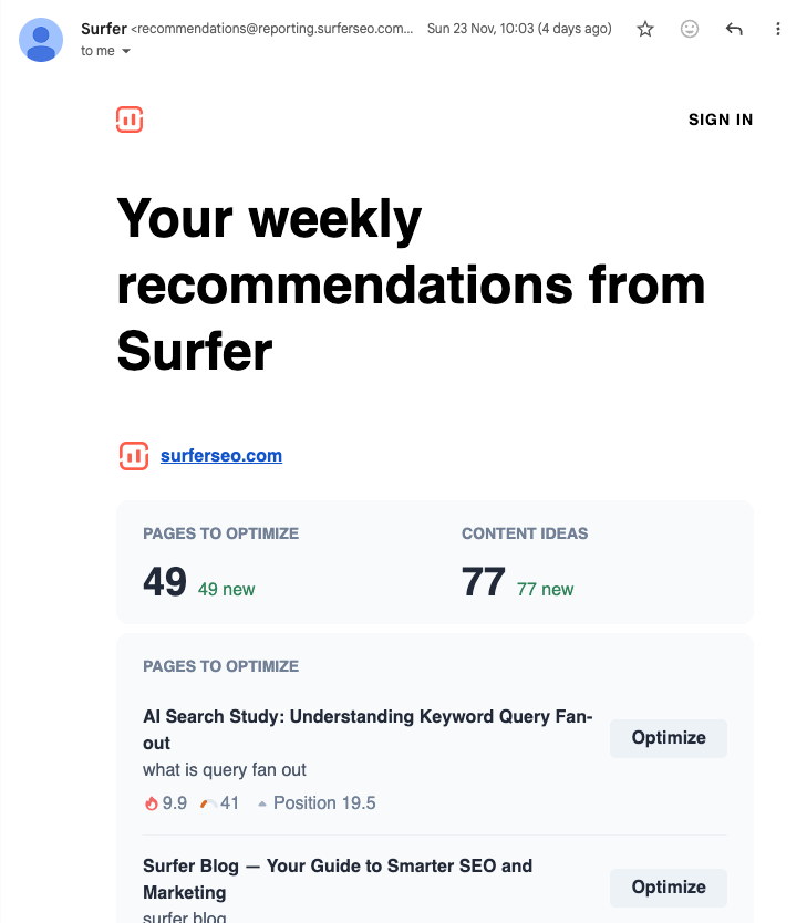 Surfer sends a weekly recommendations email for each site in your account. This includes two types of opportunities: quick optimization wins for existing pages and the best new content ideas.