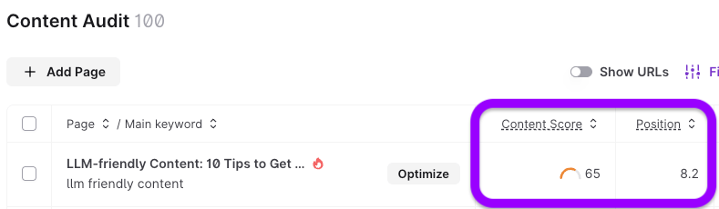For example, this page ranks in position 8.2 and has a Content Score of 65: