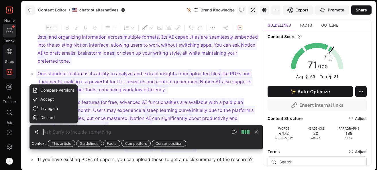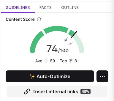 From there, it’s just a case of following the same process as above: use Surfy to help build out the content section by section, add important facts with Insert Facts, add missing entities with Auto-Optimize, and make sure you’re including internal links with Insert Links.