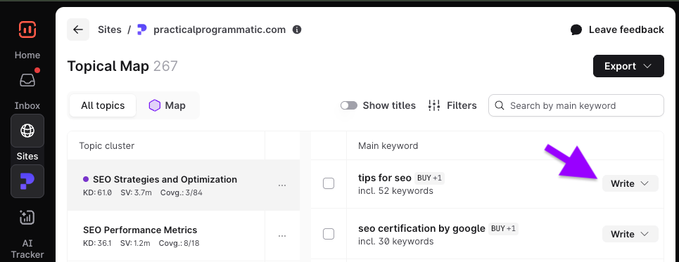 You can also use the same process as above for writing new content. Just choose a topic from the Topical Map and hit “Write”: