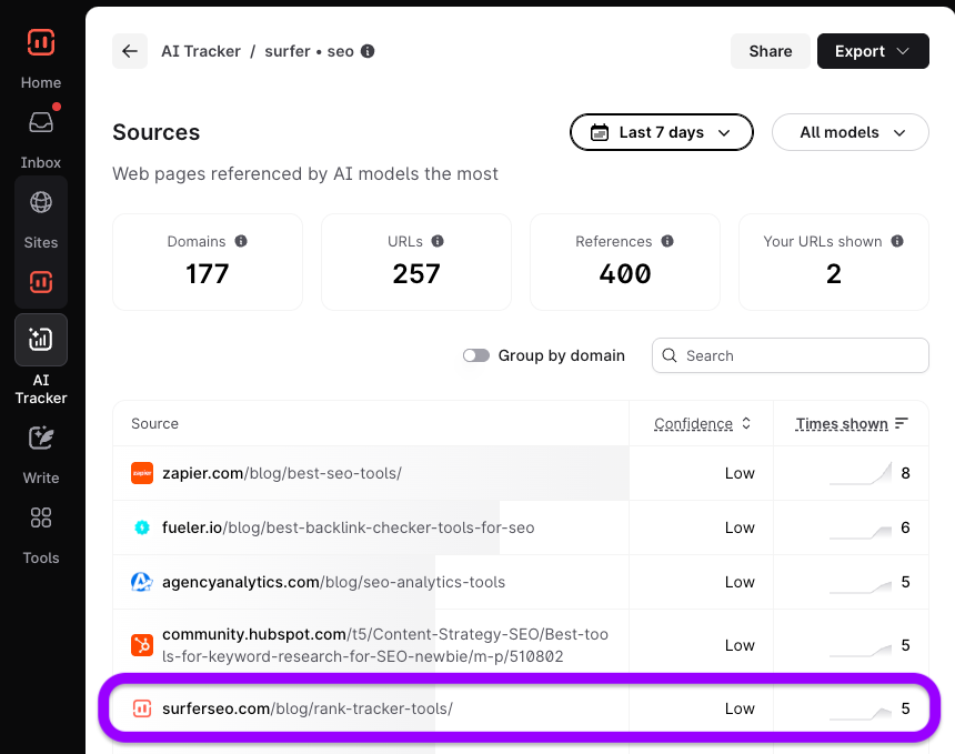 For example, AI Tracker tells us that one of the most commonly referenced sources in AI answers for the prompts we’re tracking is our list of rank tracking tools:
