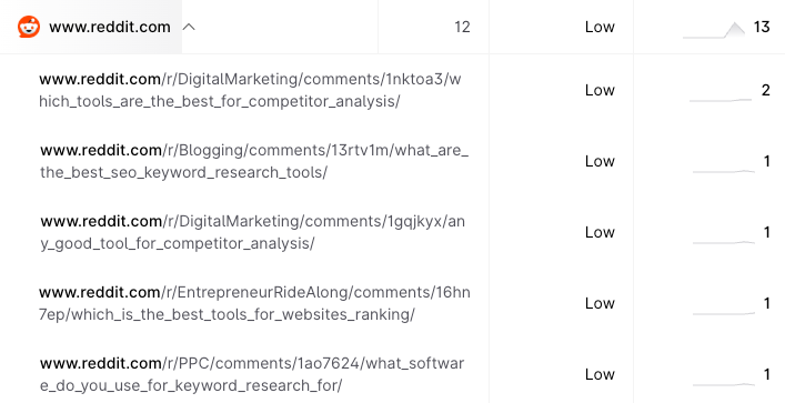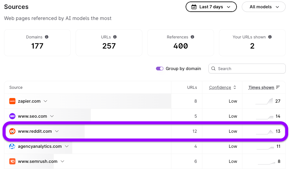 Also, if we group by domain here, it reveals that Reddit is one of the most cited domains: