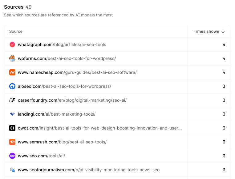 Getting mentioned on this page (or other pages AI already cites) is one of the fastest ways to lift AI visibility. So it’s worth reaching out to these sites and pitching a mention (sometimes that means a partnership or paid placement).