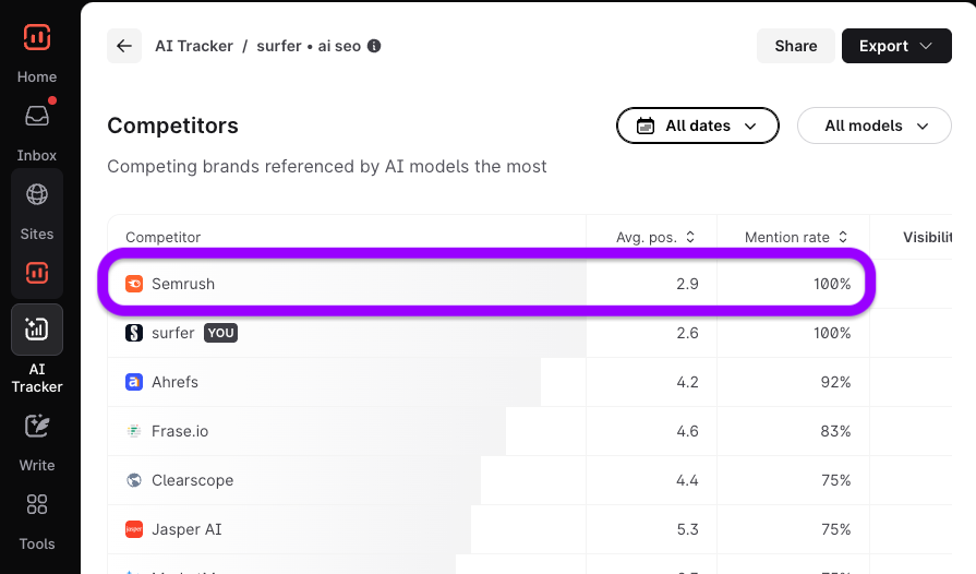 Also, if we check the Competitors report, we can see that Semrush is the winner in terms of AI visibility across all our tracked prompts—so they’re clearly doing something right: