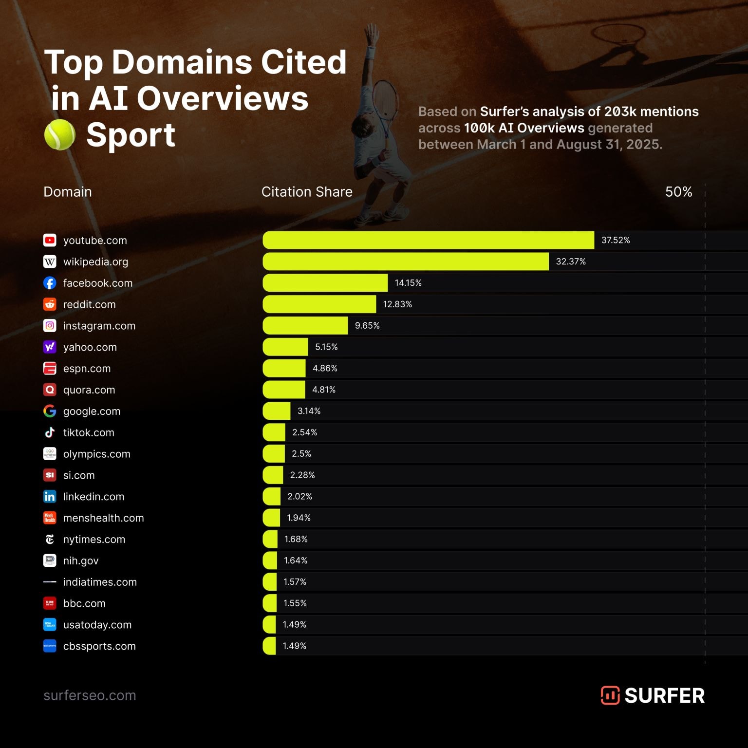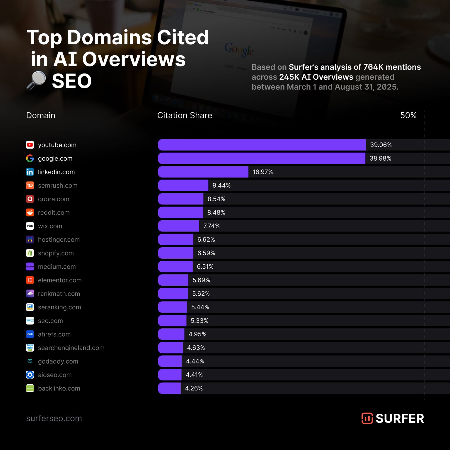 Using Surfer’s AI Tracker, which analyzed 36 million AI Overviews and 46 million citations between March and August 2025, we uncovered which domains Google’s AI cites most and how that trust varies by industry.