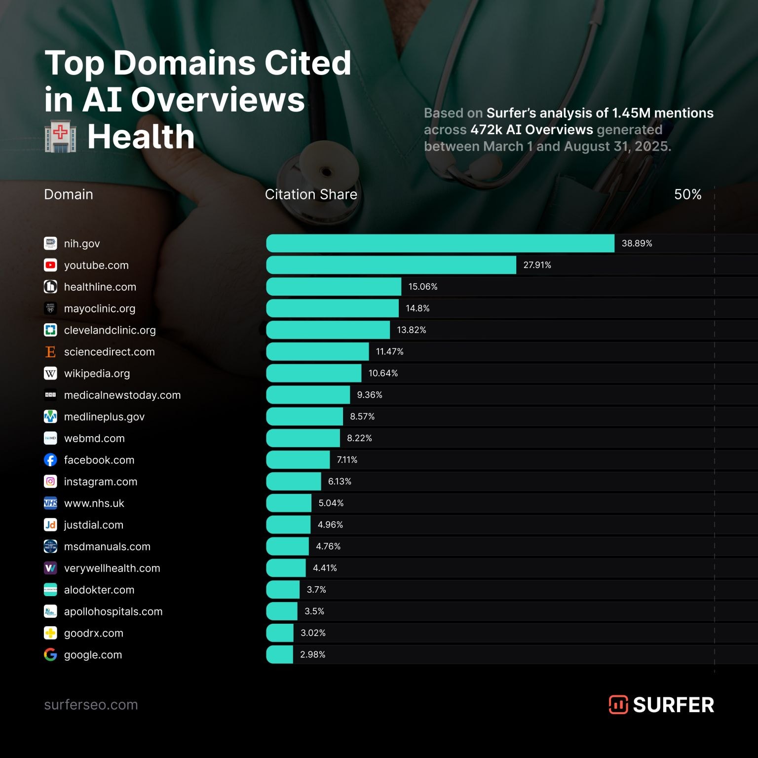 Health queries are dominated by institutions. NIH (~39%), Healthline (~15%), Mayo Clinic (~14.8%), Cleveland Clinic (~13.8%), and ScienceDirect (~11.5%) lead.