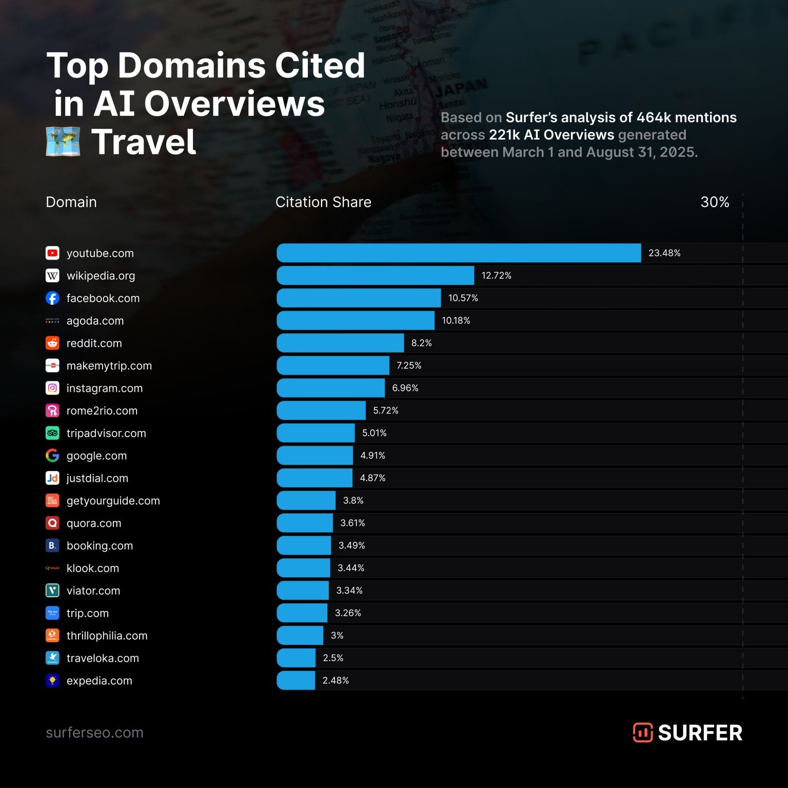 AI Tracker data confirms that travel answers pull from global platforms for scale, local leaders for context, and UGC for candid advice.