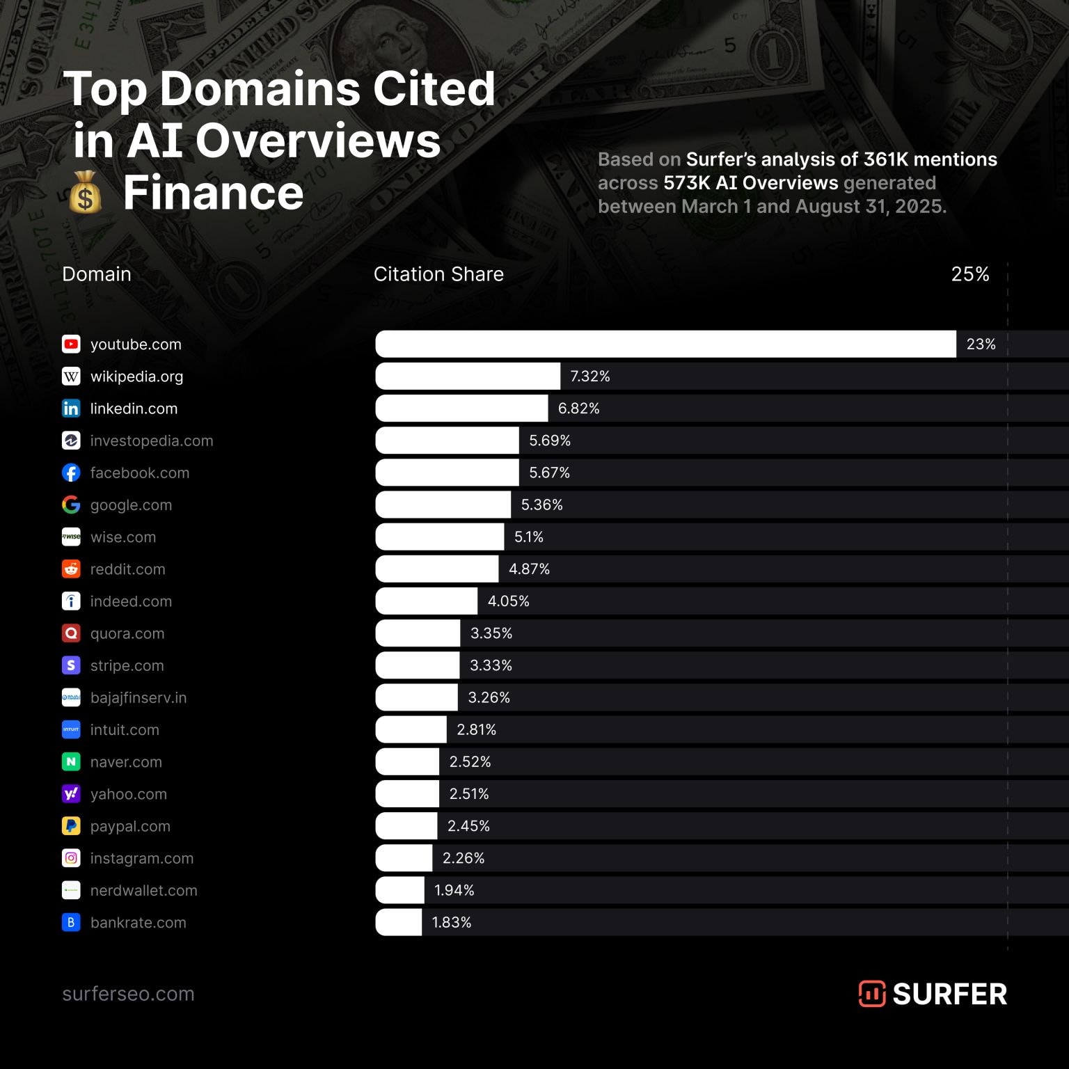 In finance, YouTube (~23%) dominates citations — users lean on explainers, tutorials, and video commentary for money matters.