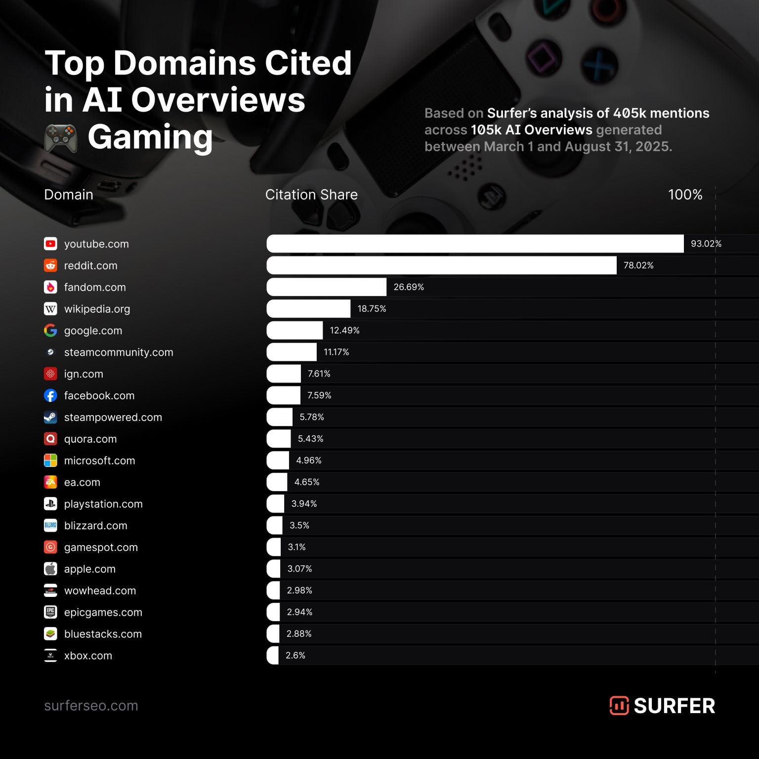 Gaming is powered by UGC. YouTube (~93%) and Reddit (~78%) overwhelm the field, with Fandom (~26.7%) and Steam Community (~11%) also key. Official publisher sites appear, but far less often.