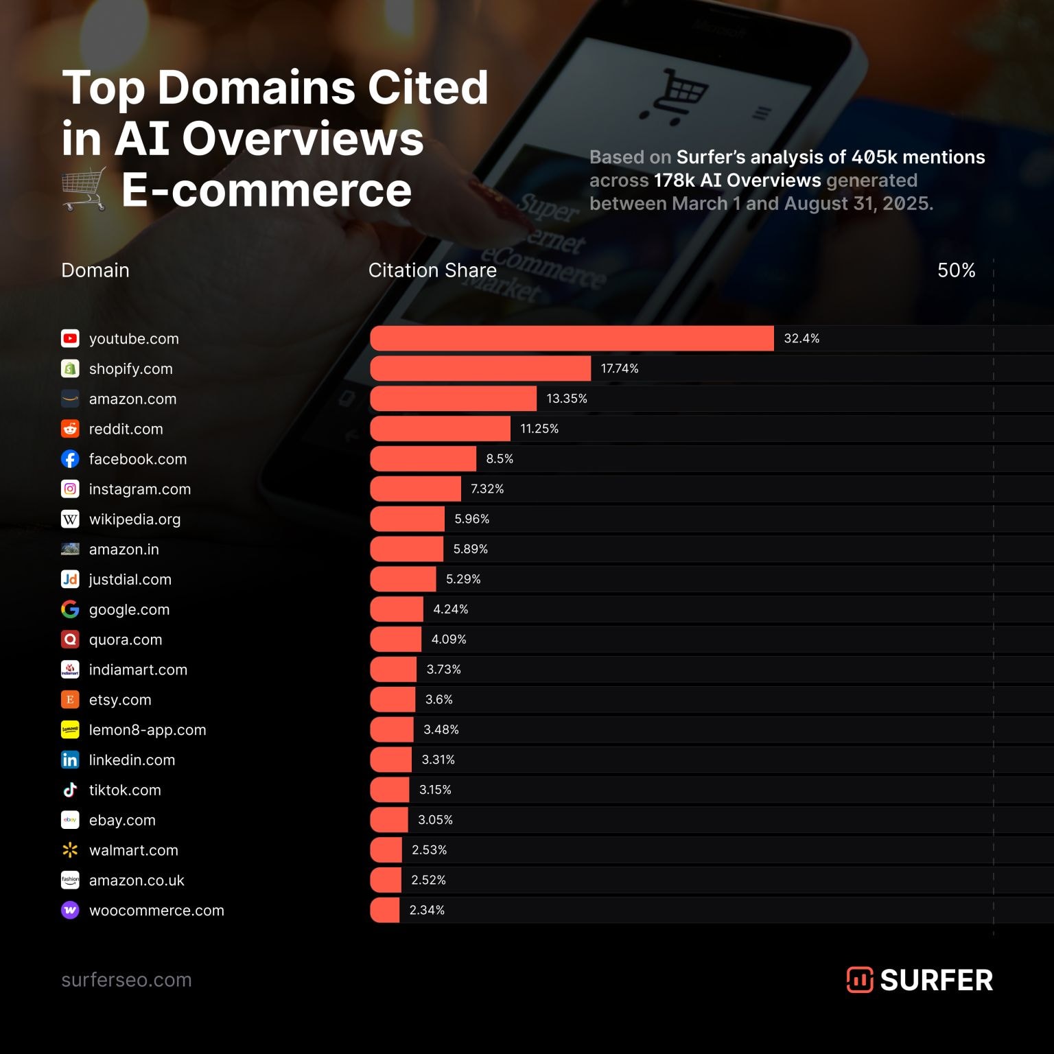 YouTube (~32.4%) leads again, followed by Shopify (~17.7%), Amazon (~13.3%), and Reddit (~11.3%). Social platforms and regional marketplaces also appear prominently.