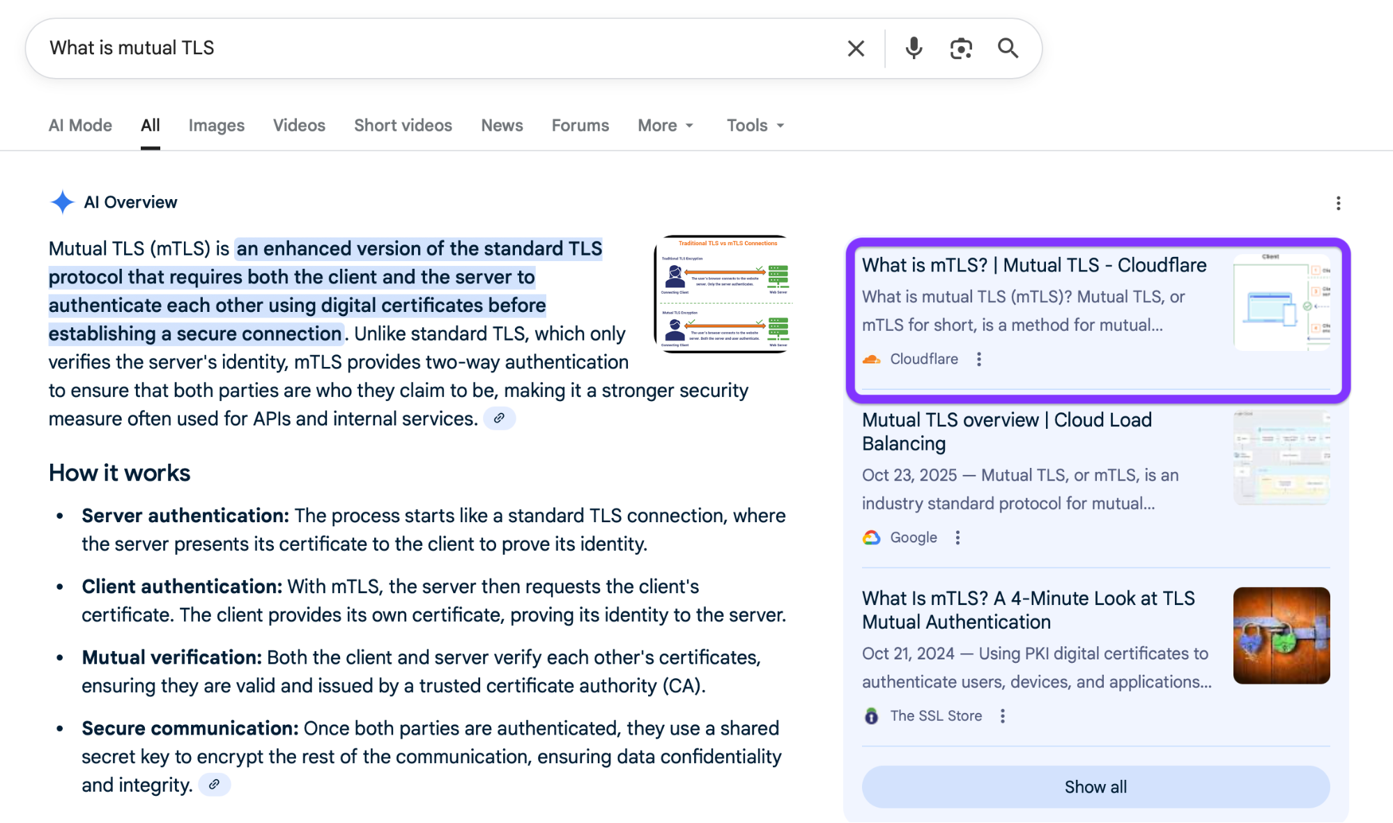 Take a look at Cloudflare's article on mTLS. The page contains plenty of strong entity signals, most notably: