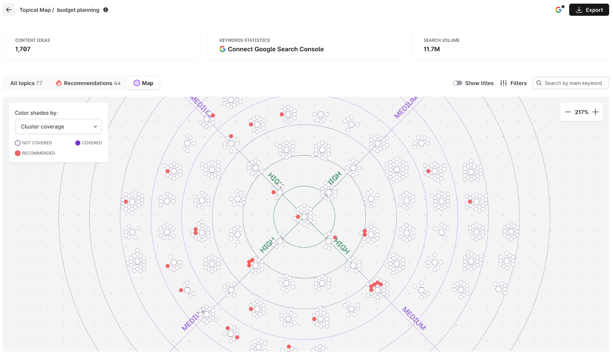 If you need help with entity optimization, Surfer's Topical Map takes care of the heavy lifting. Give it the main keyword, and it will show you: