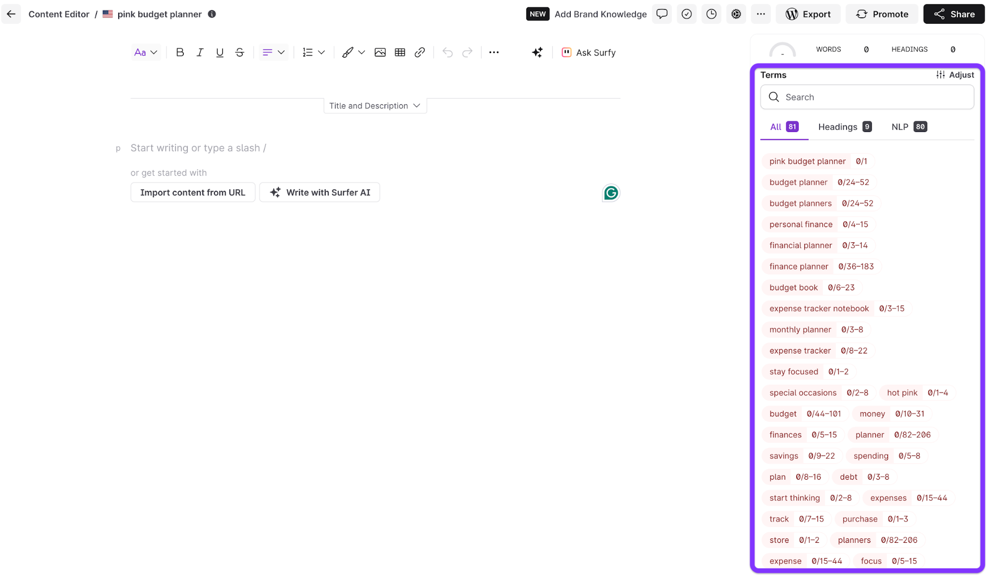 For each topic you want to cover, you can open Surfer's Content Editor.
