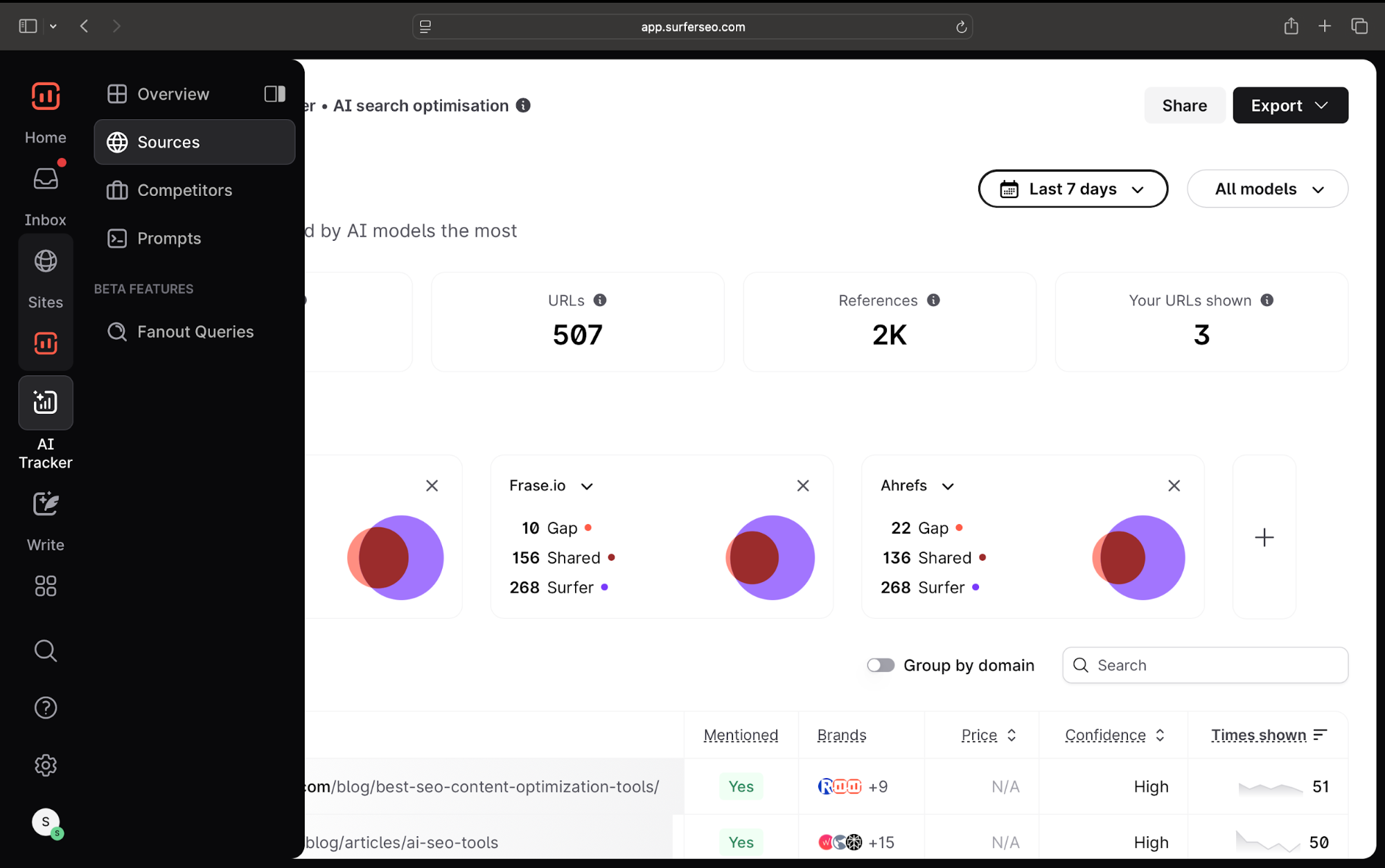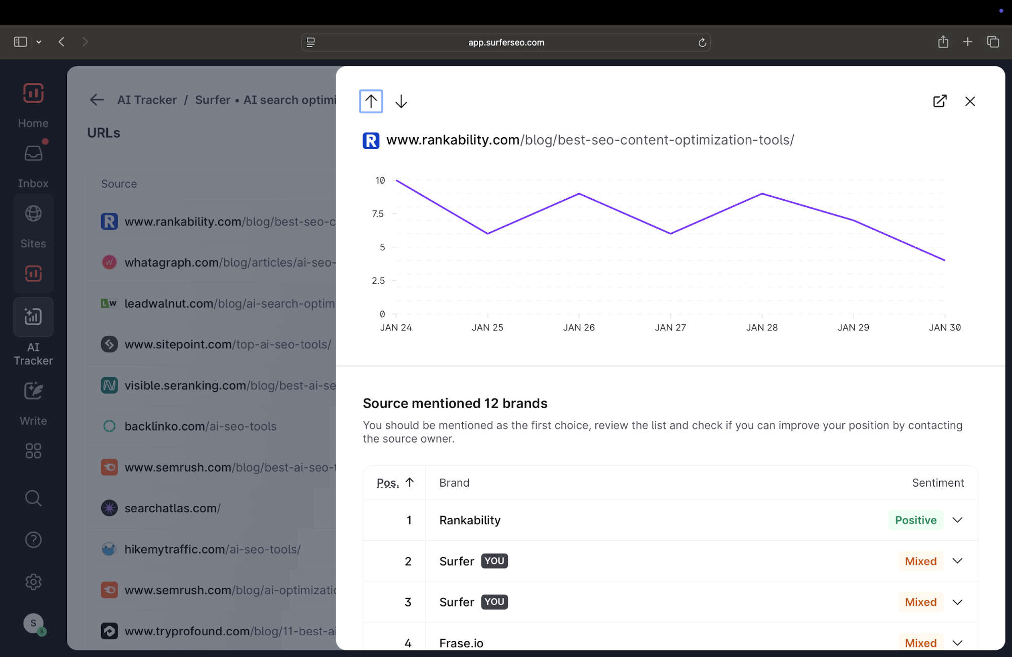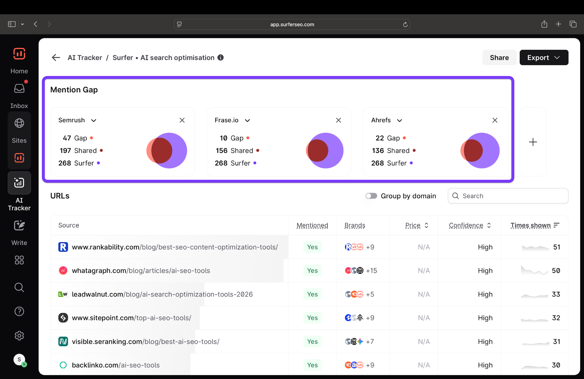The Mention Gap report in Surfer's AI tracker is handy to analyze opportunities for brand mentions that competitors already feature in.