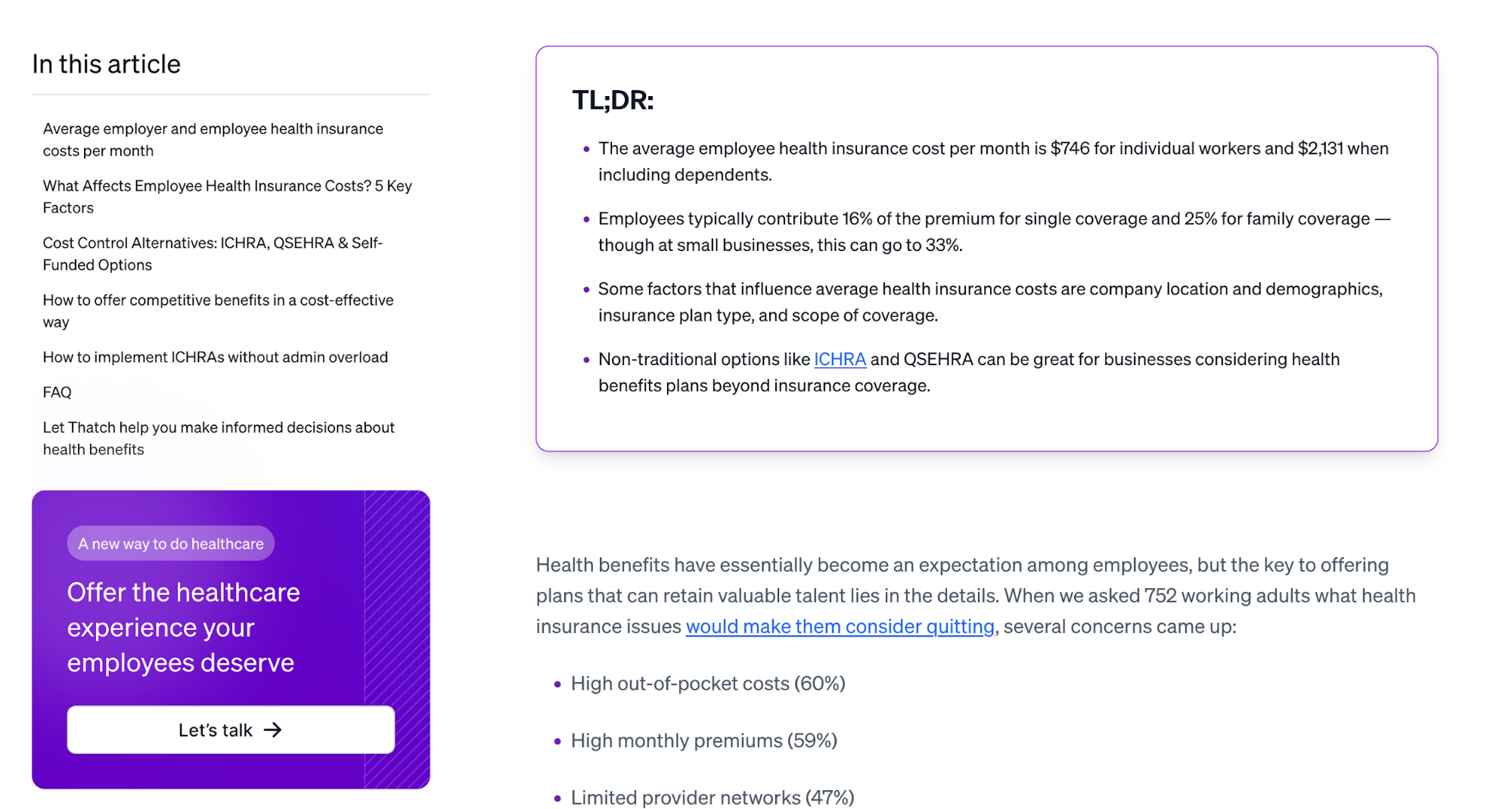 If you open pretty much any article, you'll see easily extractable data in different formats (tables, lists, bullet points, etc.), as well as direct answers to users' questions that directly tie content to the corresponding prompts.