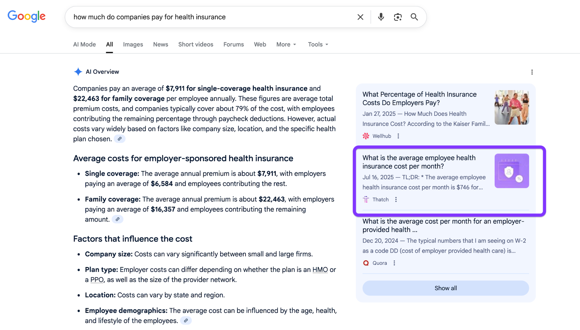 As a result of effective entity optimization, the page is cited as the first resource in the AIO's response to the related query.