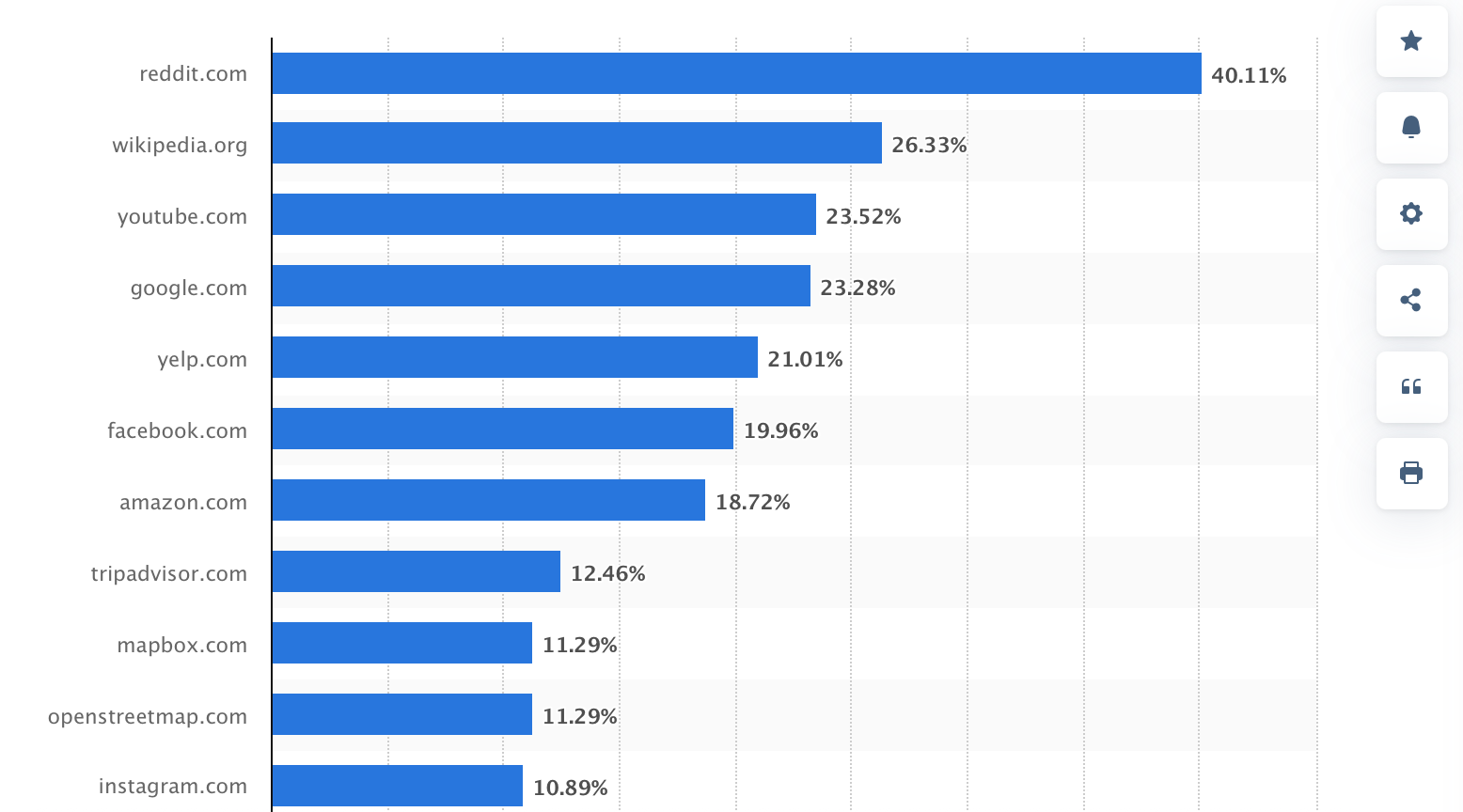 A particularly effective tactic is to get active on forums and communities. Statista's June 2025 report showed that Reddit was the most frequently cited resource, and the top list included review platforms and social media websites.