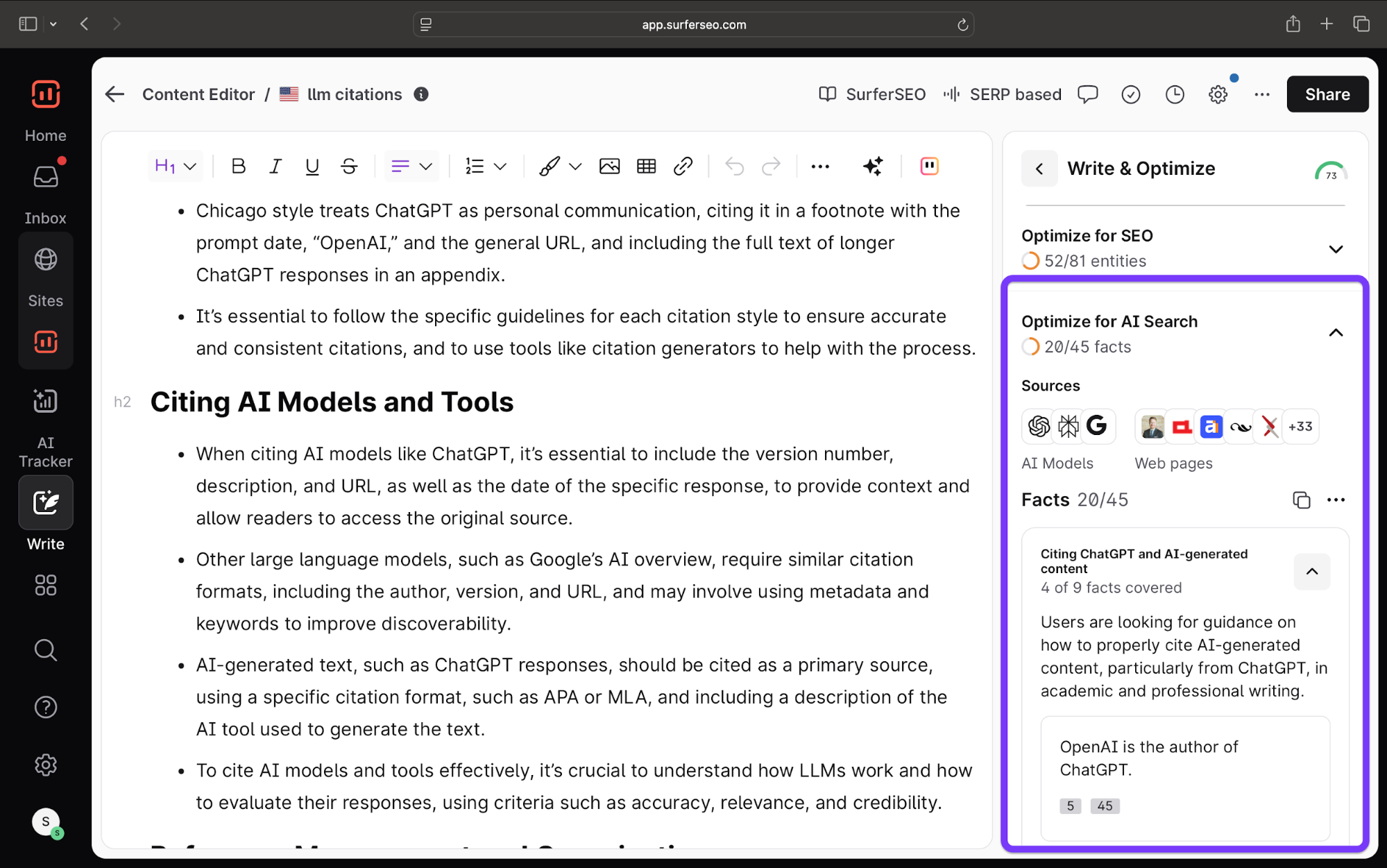 Surfer offers a comprehensive suite of tools that help you optimize content for both traditional and AI-powered search engines. Besides coming up with topic ideas and tracking AI citations across platforms, it lets you: