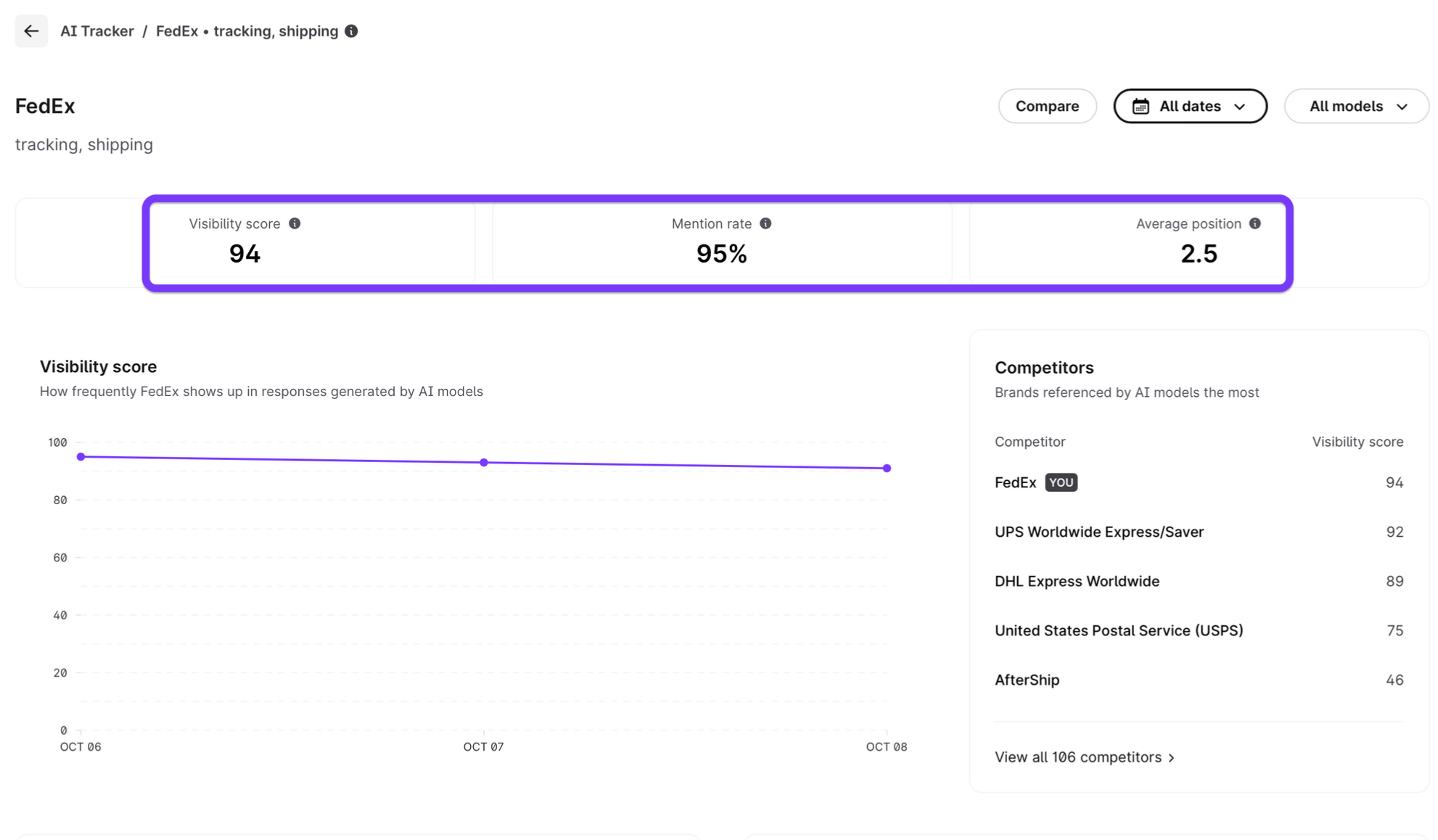 The tracker also tells you everything you need to know about your brand's performance in AI engines, most notably: