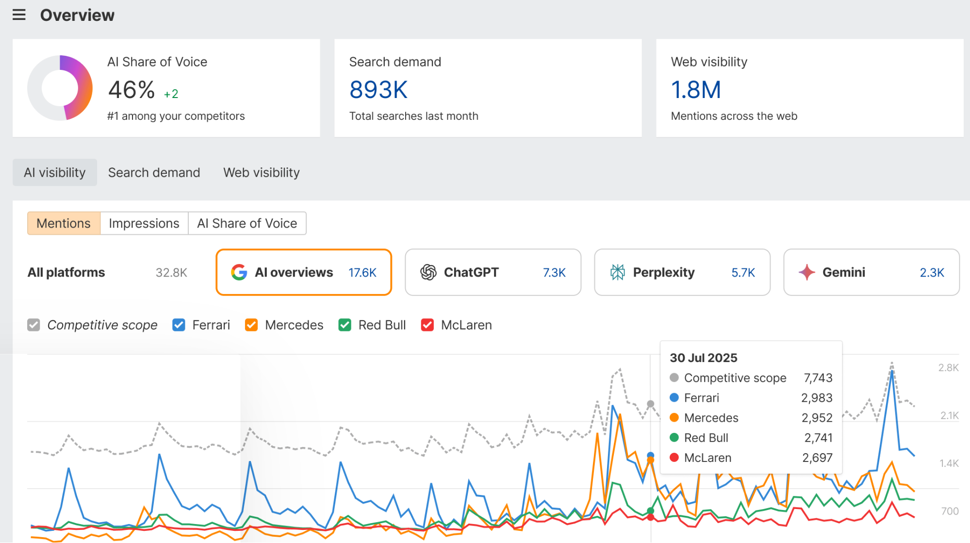 If set up and used correctly, Brand Monitoring can give you a bird's-eye overview of your brand's online visibility and sentiment, which you can use to refine your content strategy and optimize for AI answers.