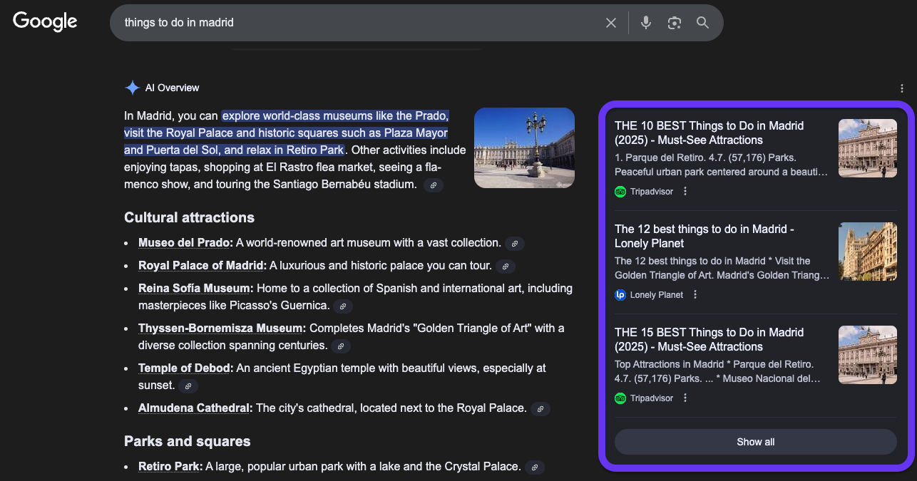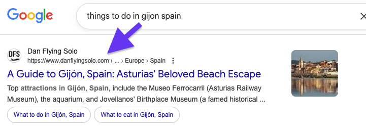 Unlike Gemini, the AIO could have searched for something like “things to do in gijon spain”, where the cited page ranks in the “blue link” results.