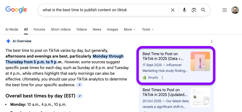 For example, the top AIO citation for “what is the best time to publish content on tiktok” is this page from Shopify: