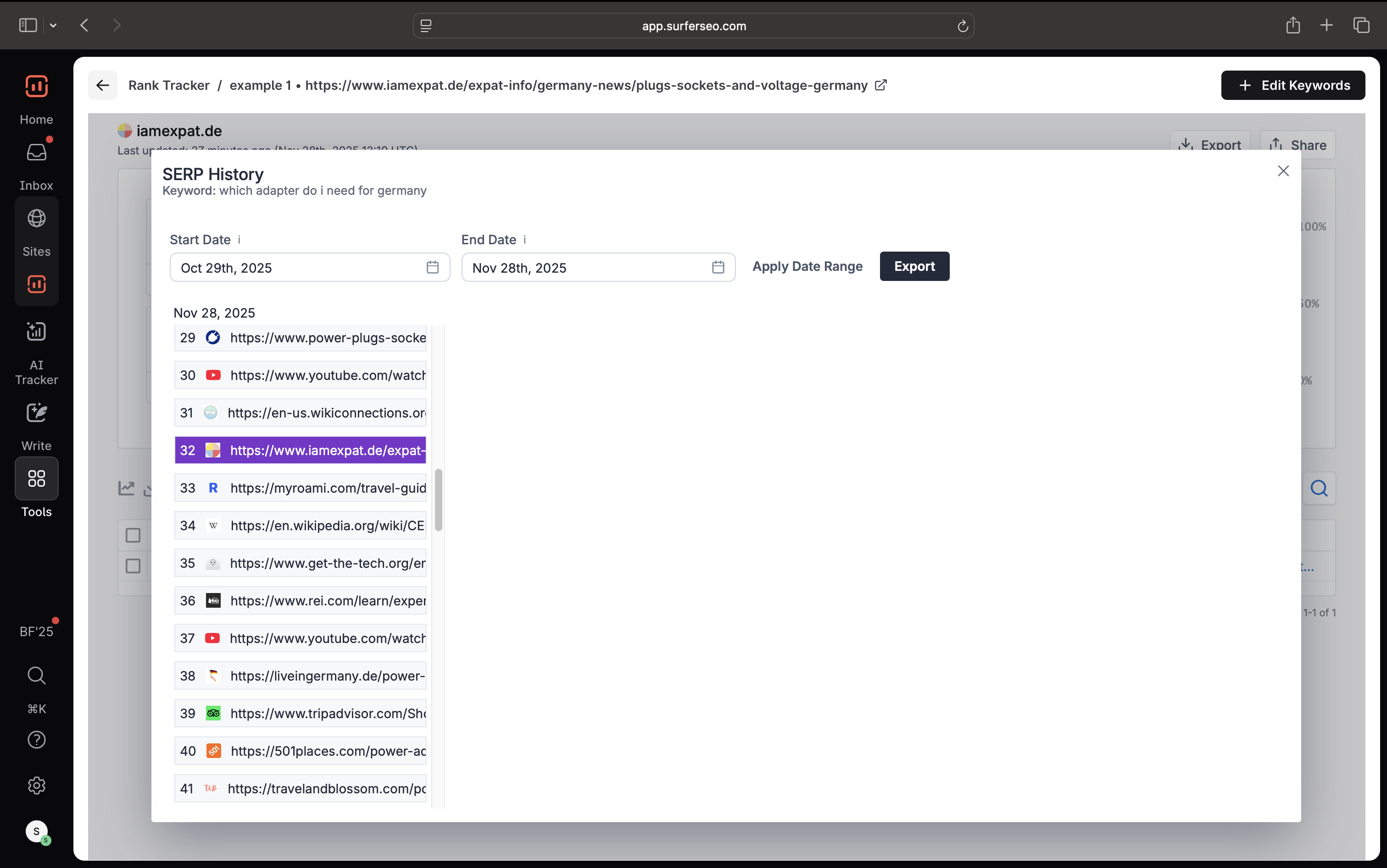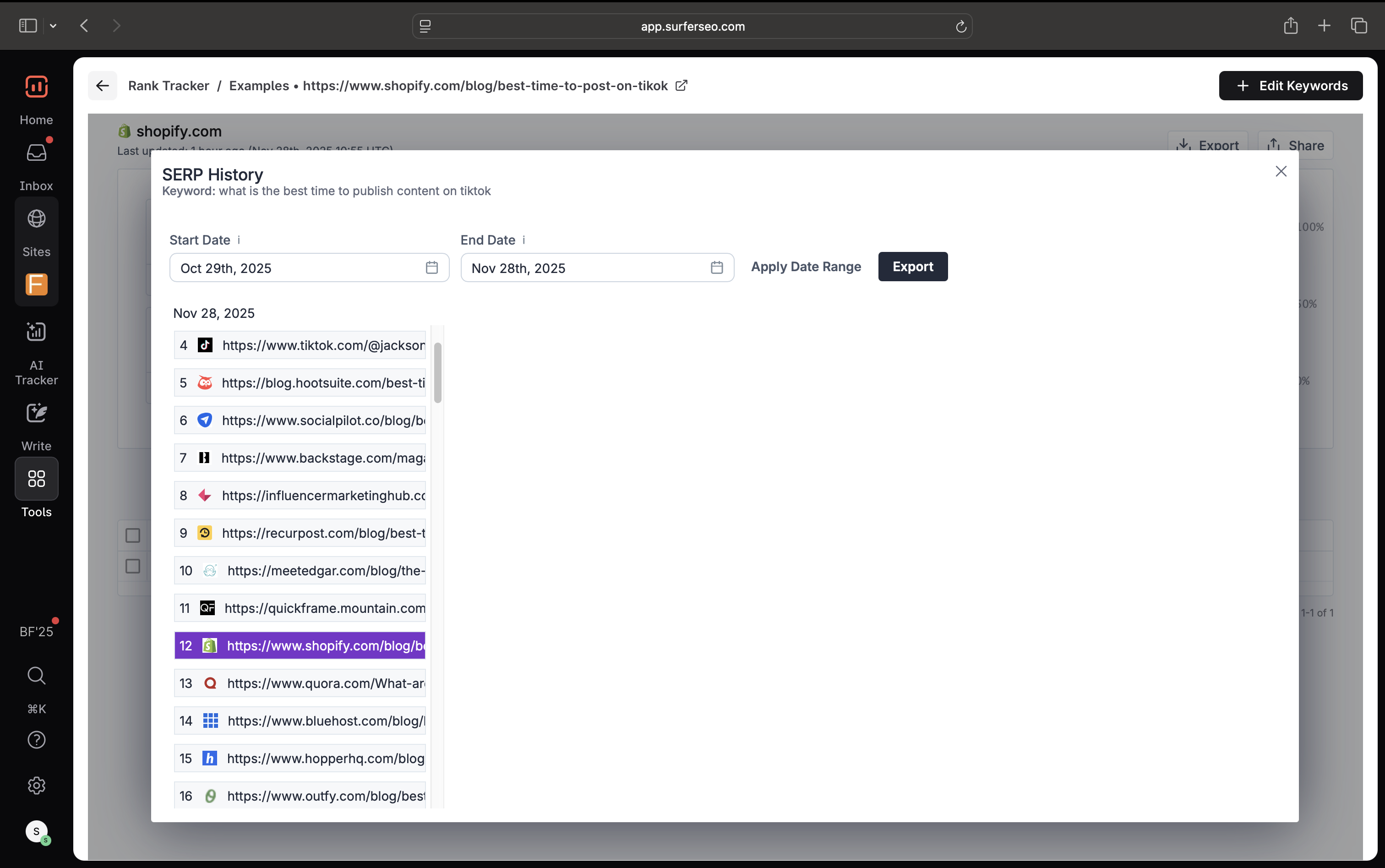 If I check the rankings for that keyword in Surfer’s Rank Tracker, I see that page ranking in position #12: