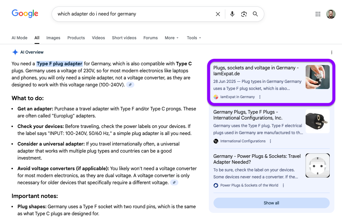 I think most of us would assume that Google’s AIO citations (like the ones pictured below) rank somewhere in the regular “blue link” results—either for the query itself or fan-out queries.