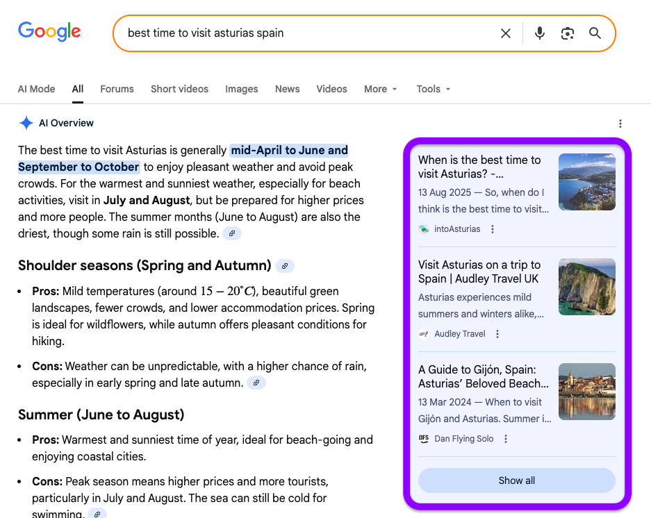 For example, here are the top three citations for “best time to visit asturias spain”: