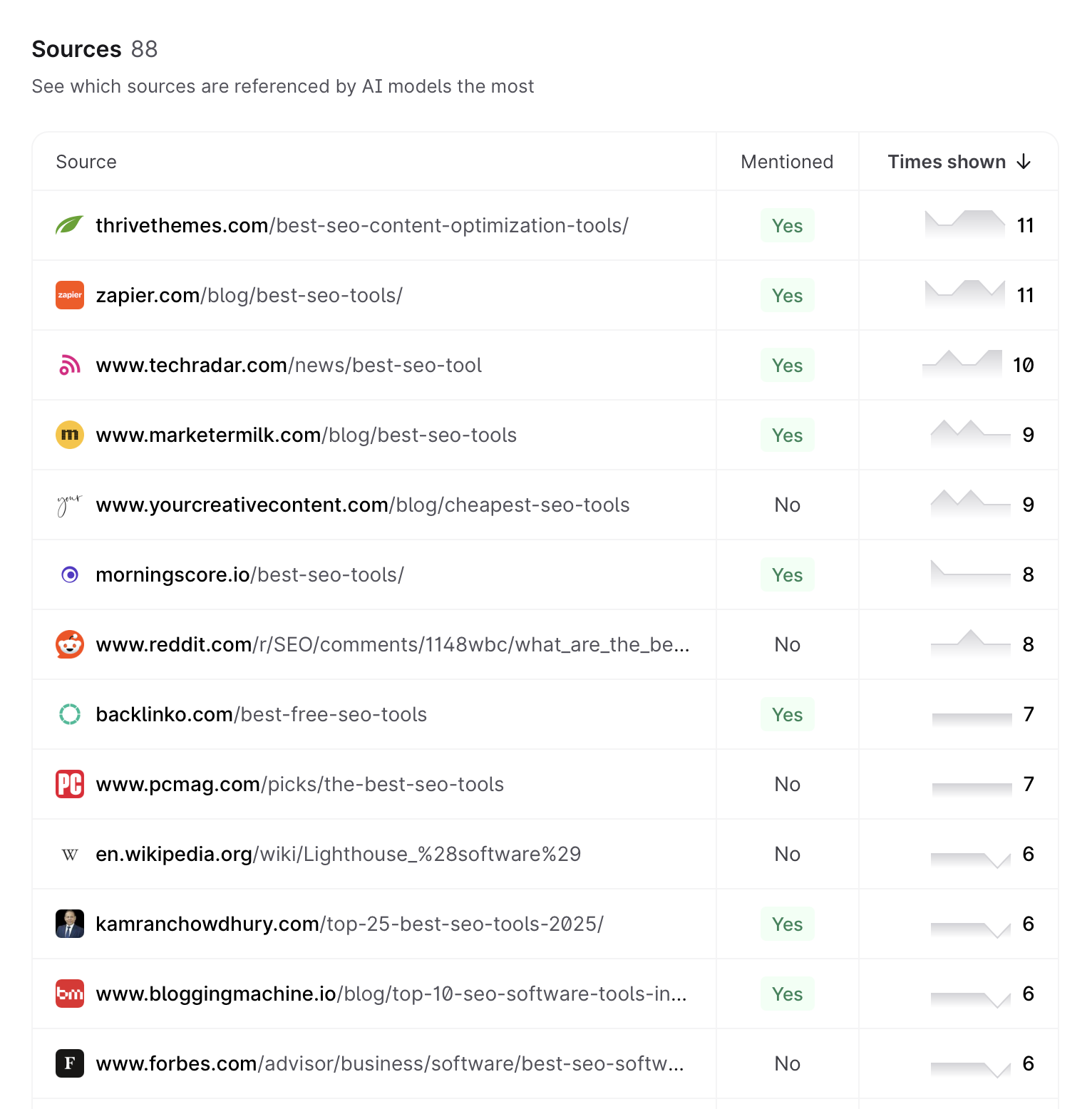 Maybe some of these pages rank in Google for my tracked queries or their fan-outs, maybe they don’t. It doesn’t matter because I know they’re already getting cited, so all I need to do is to try to get mentioned on them.