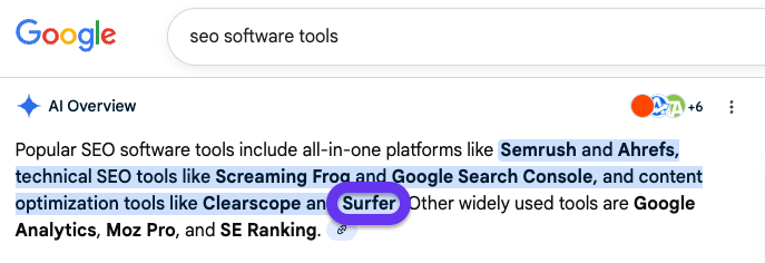 For example, Surfer is recommended in the AIO for “SEO software tools”...