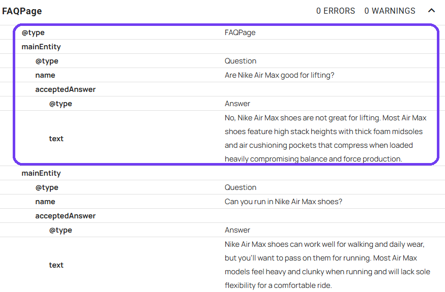 Each question and answer within the FAQ section is clearly highlighted via the @type Question and @type Answer labels under the FAQPage schema markup.