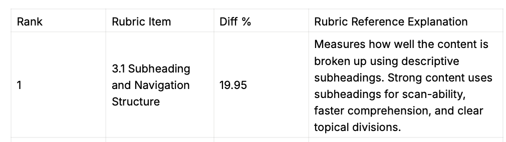 One of our internal studies on AI Overview answers revealed that pages in AI Overview results score 19.95% better on subheadings and navigation structures than non-included pages.