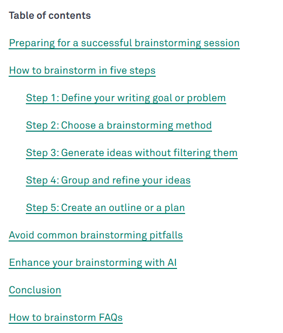 Each H2 and H3 then breaks the page title down into separate talking points in a logical, hierarchical order—from how to prepare for a brainstorming session, to conducting the brainstorm itself, common mistakes you should avoid, etc.
