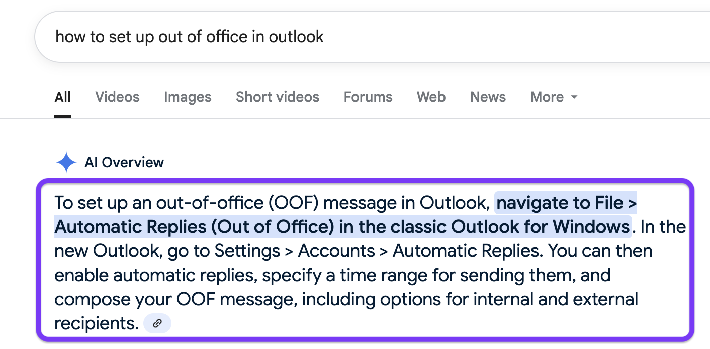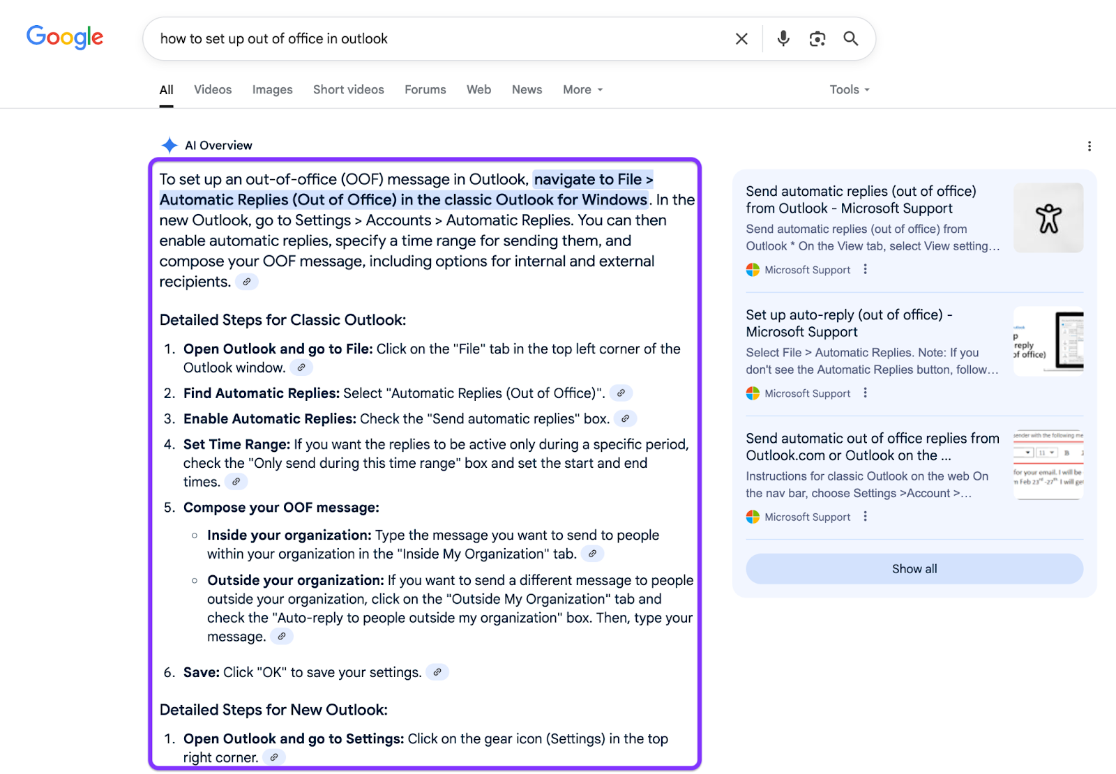 To illustrate, here's what happens if I type in "How to set up out of office in Outlook?":