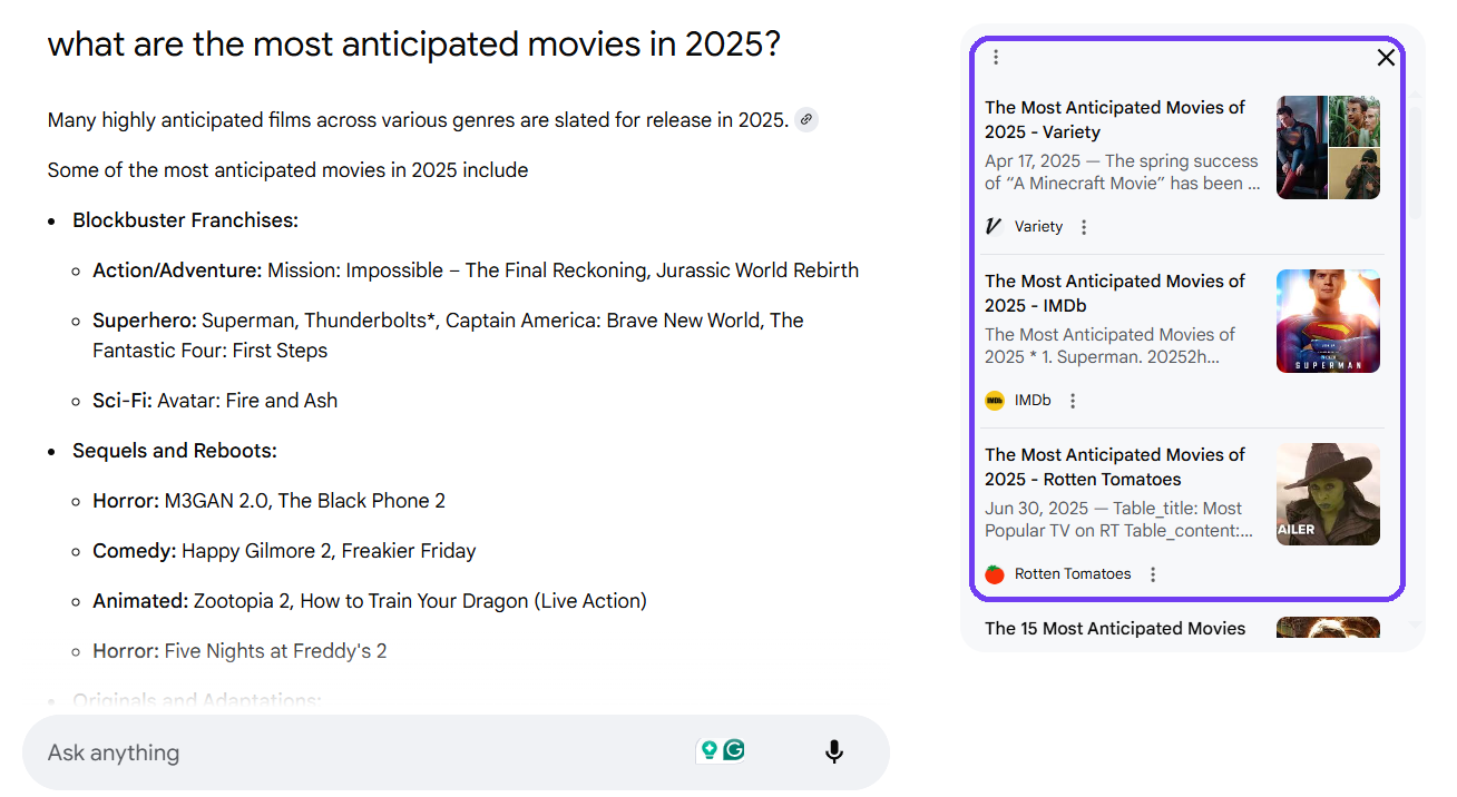 With RAG, however, that's no longer the case. That's why Google's AI Mode is capable of answering queries like "What are the most anticipated movies in 2025?", for example: