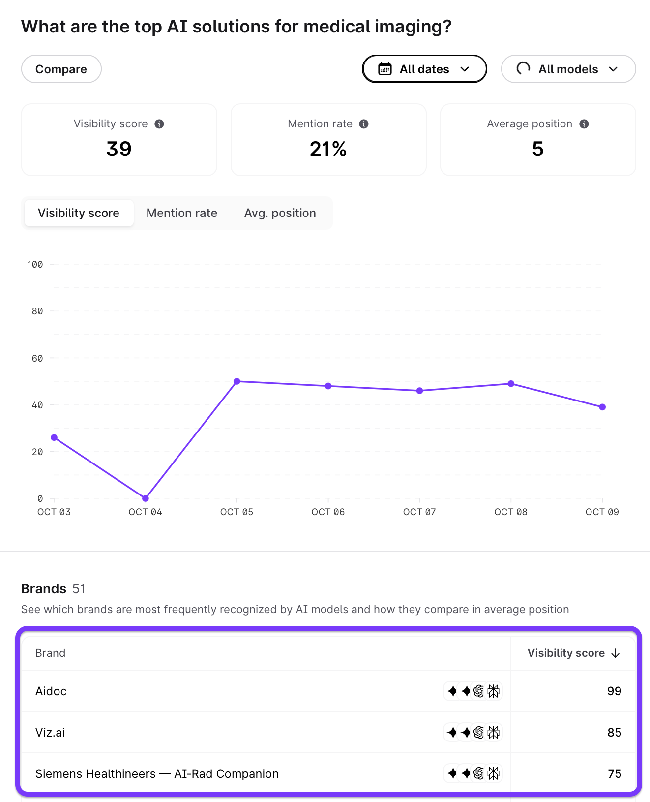 In fact, you can see that they're only mentioned 21% of the time someone searches for "What are the top AI solutions for medical imaging?"