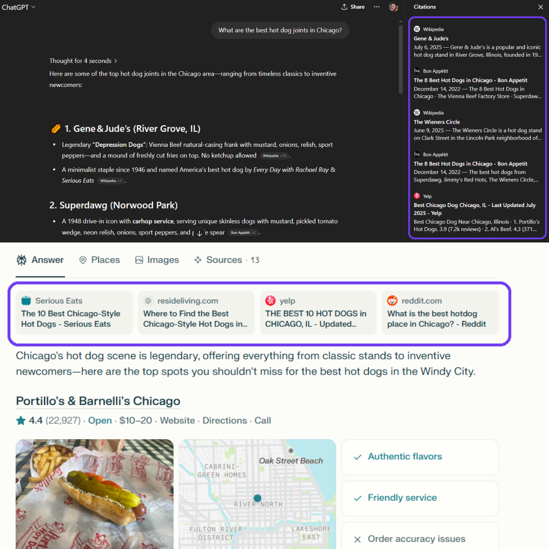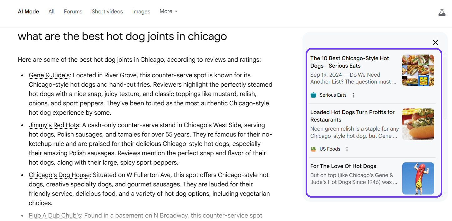 Here's what happens if I type in "What are the best hot dog joints in Chicago?" in Google's AI Mode: