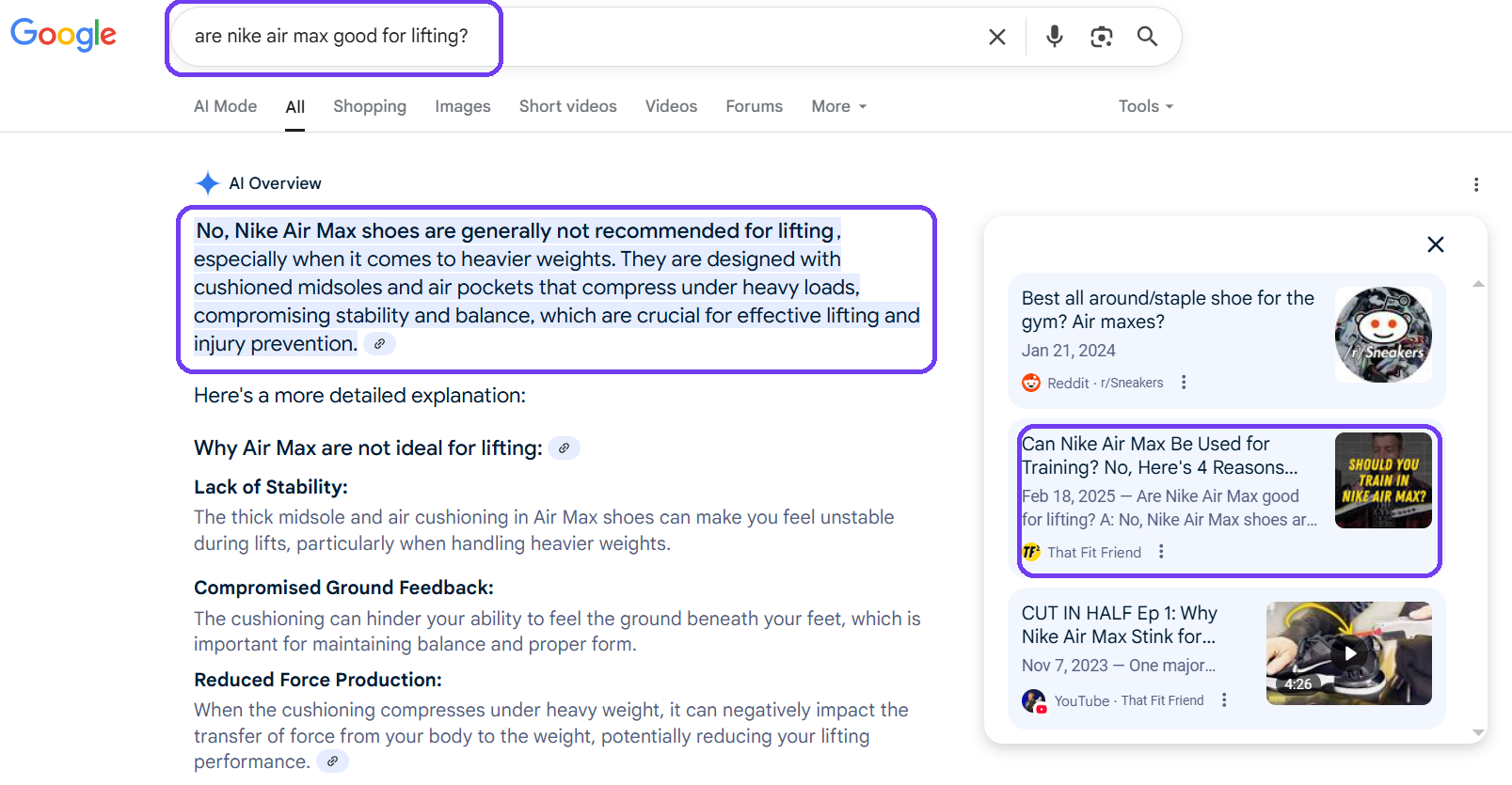 Notice how the FAQ copy is an exact match with the one written in the Schema markup. And here's what happens if I Google "Are Nike Air Max good for lifting?"