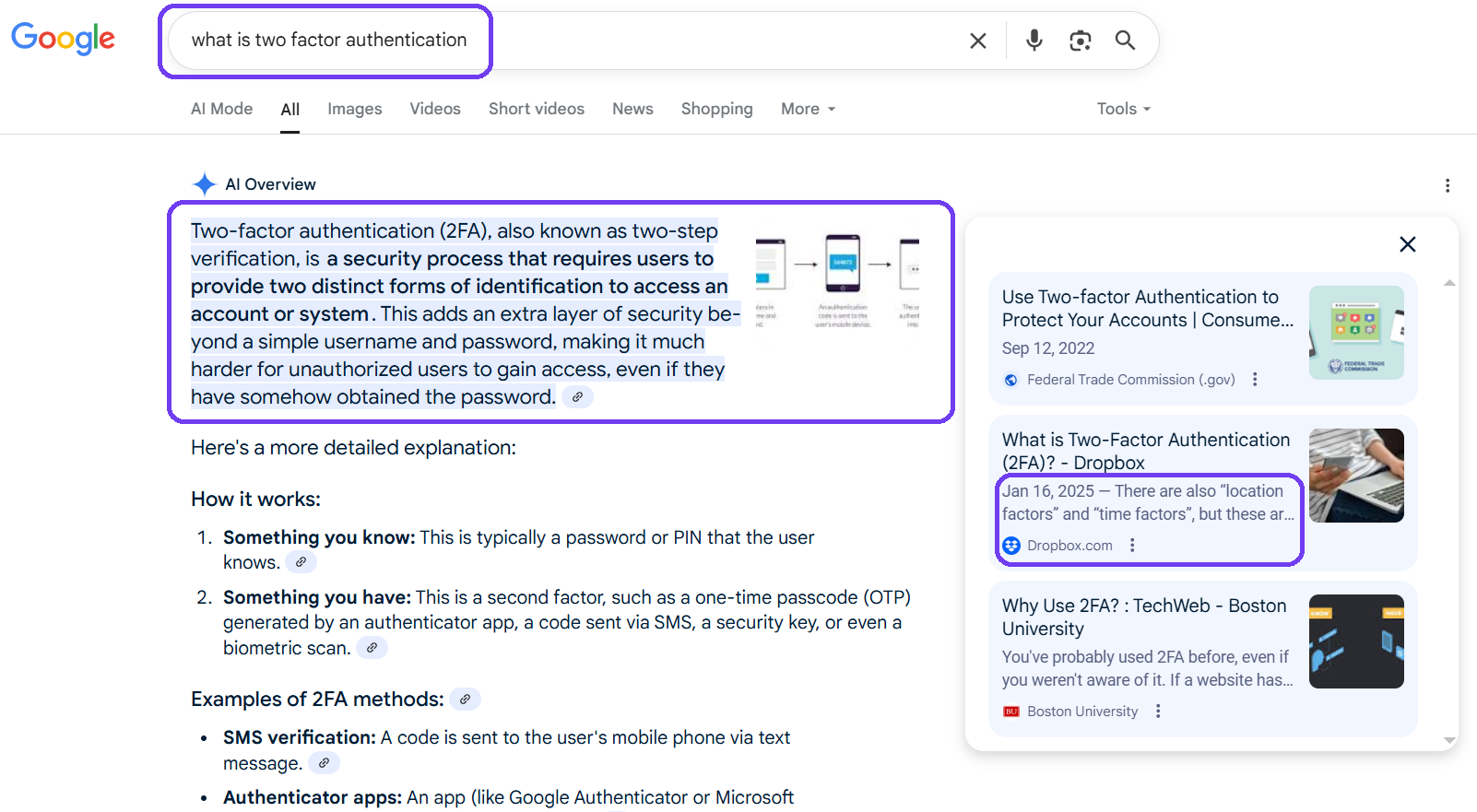 The text fragment I showed above is actually listed as a resource in AIO for the "What is two-factor authentication" search query.