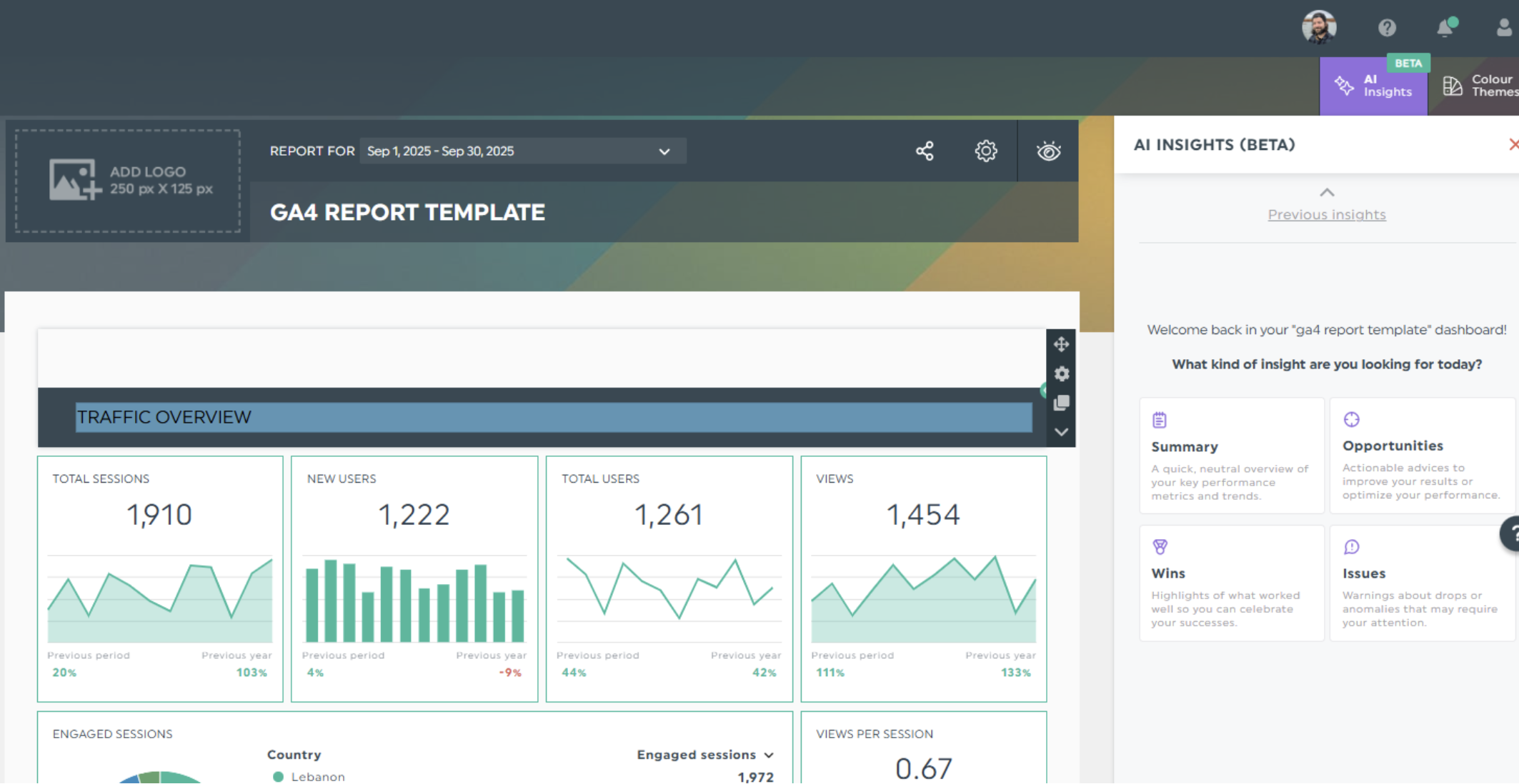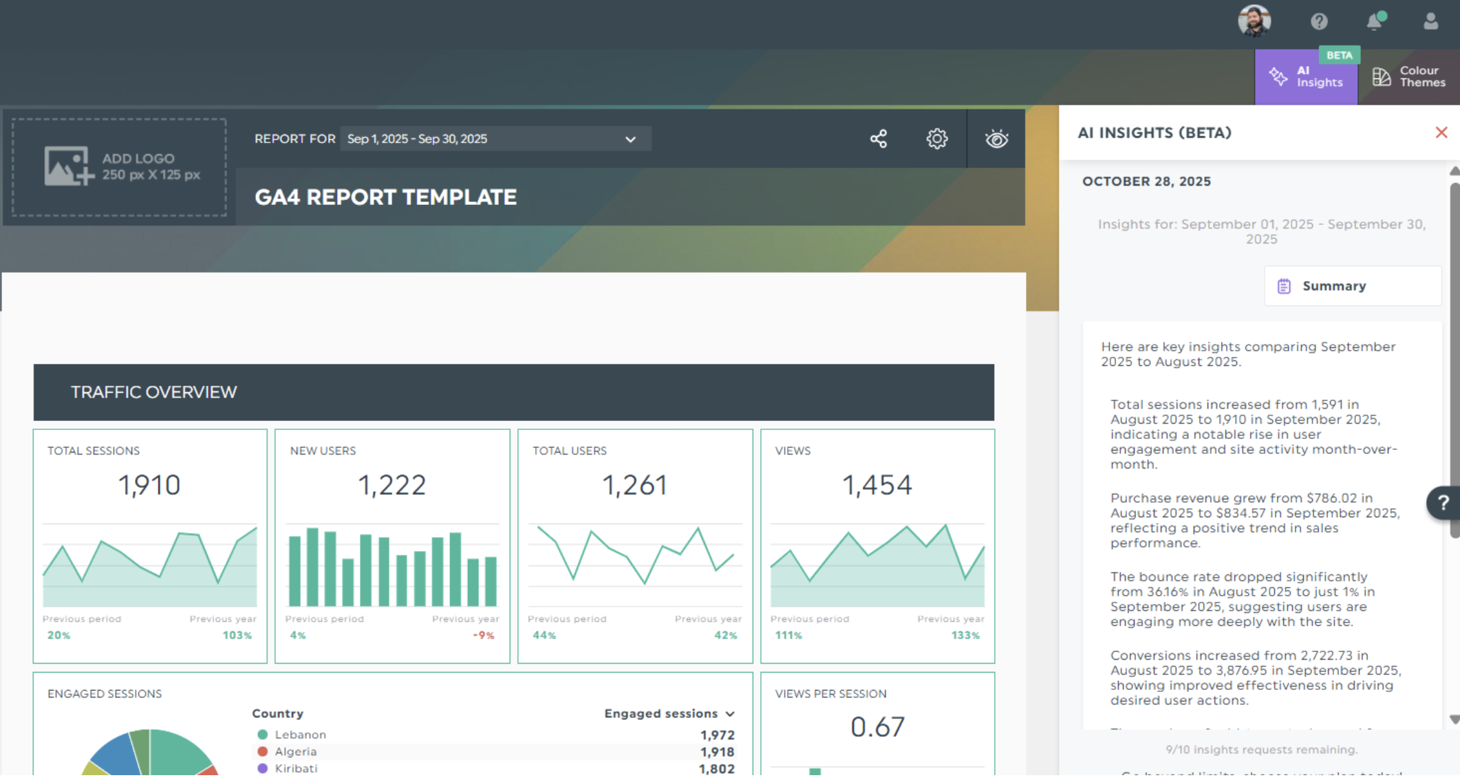 I like that the data reports update automatically –set your date range, schedule email/PDF sends, or share a live link, and the AI notes refresh with new data.