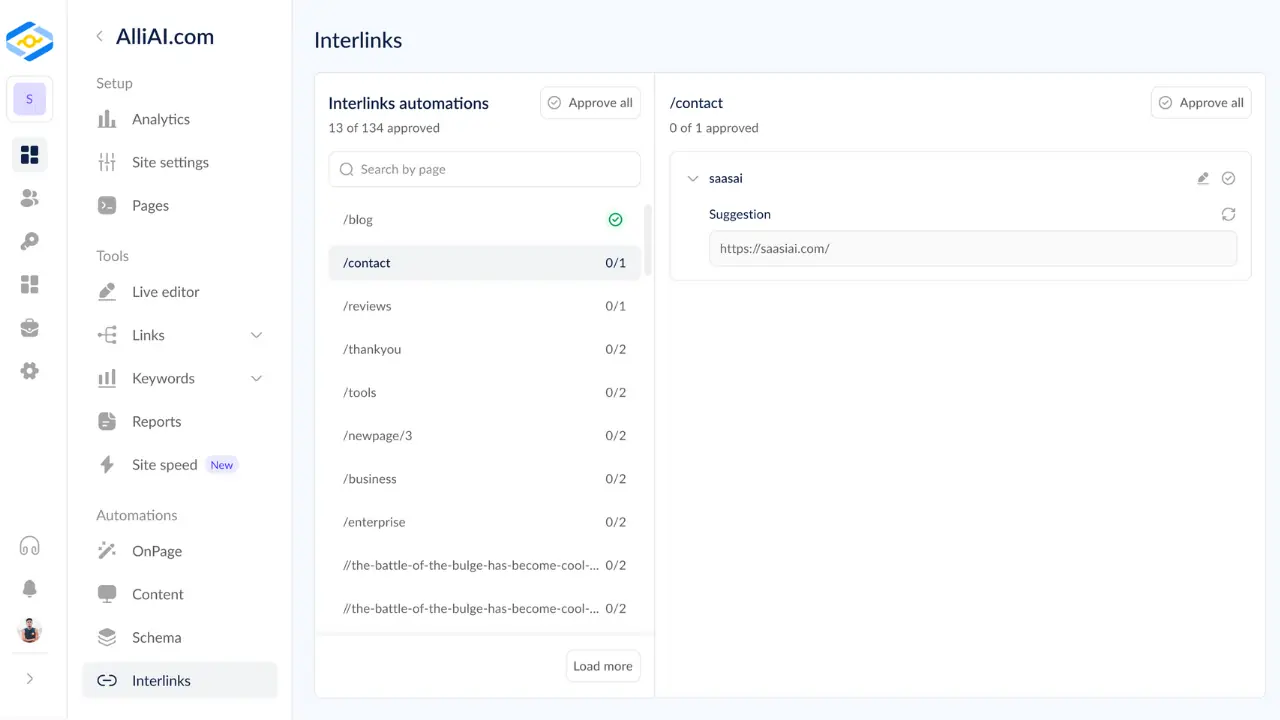 Other AI features on the platform include a Schema Generator and an internal linking automation tool. With the schema markup feature, Alli AI scouts your website to generate a relevant schema markup, which helps search engines better understand the content of your site. If you already have existing markup, the tool suggests improvements.