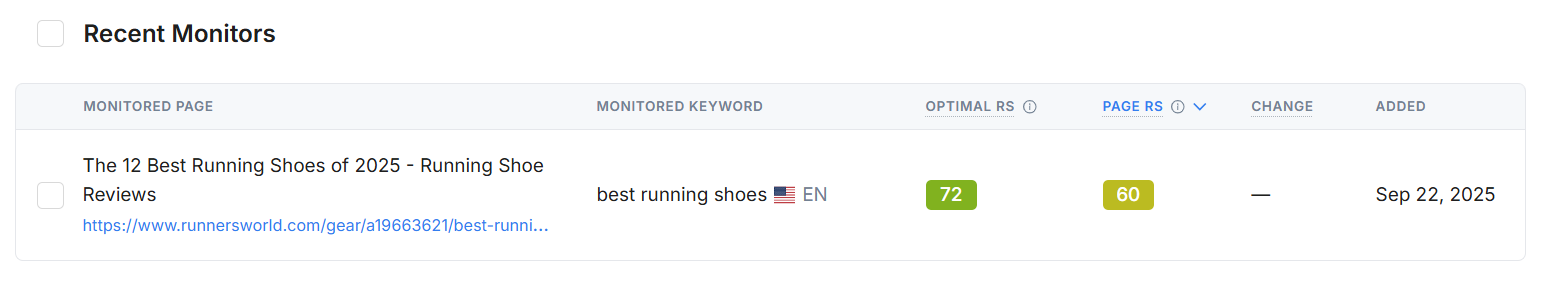 Rankability also includes a keyword research feature that lets you find terms related to your primary keyword, along with metrics like search volume, CPC, and keyword difficulty. You can also use it to monitor existing pages on your site. Just enter the primary keyword and page URL, and Rankability will show your current score as well as the recommended score.