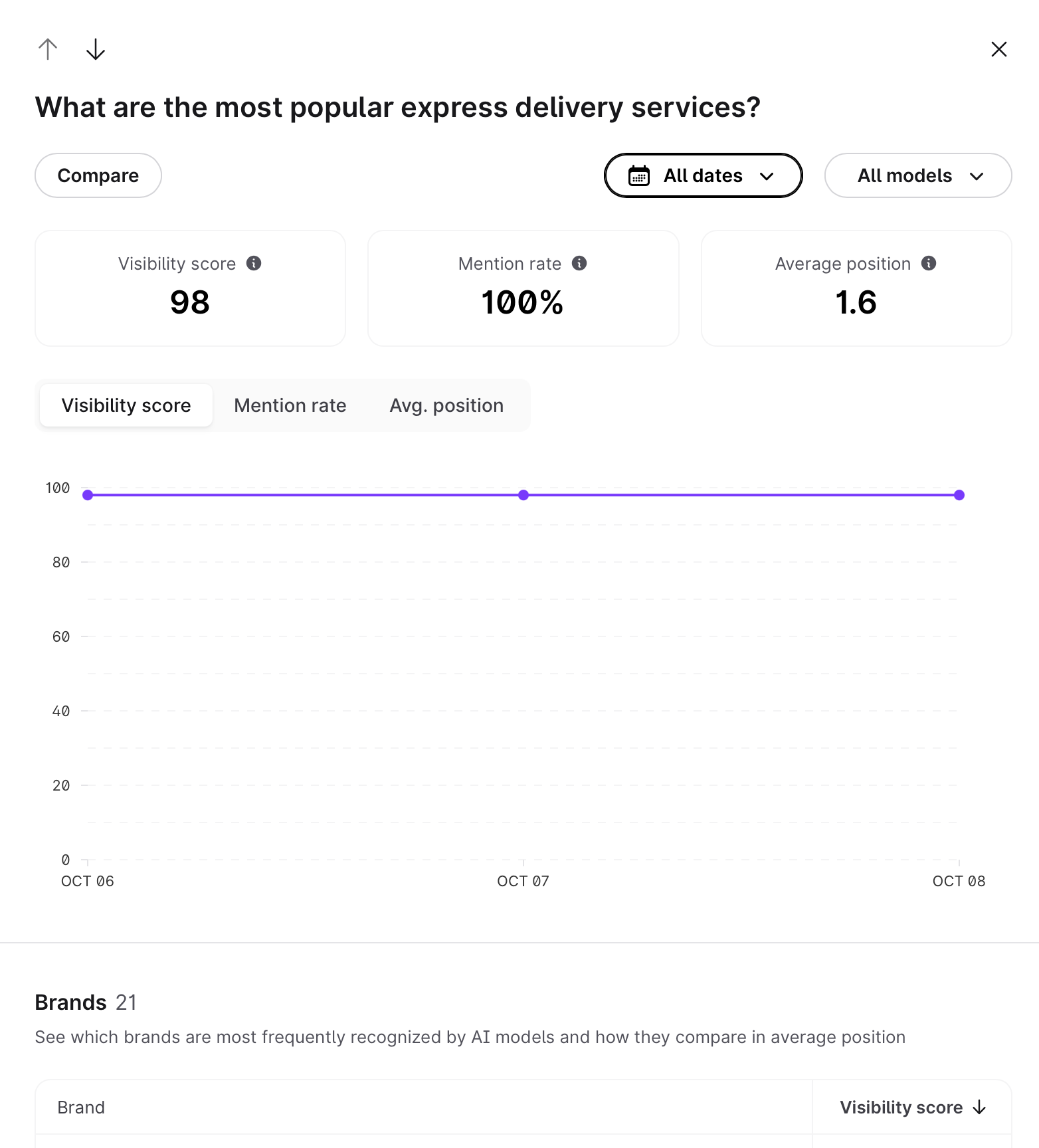 - The Visibility score is an overall metric showing your brand's appearance and ranking in AI generated results.