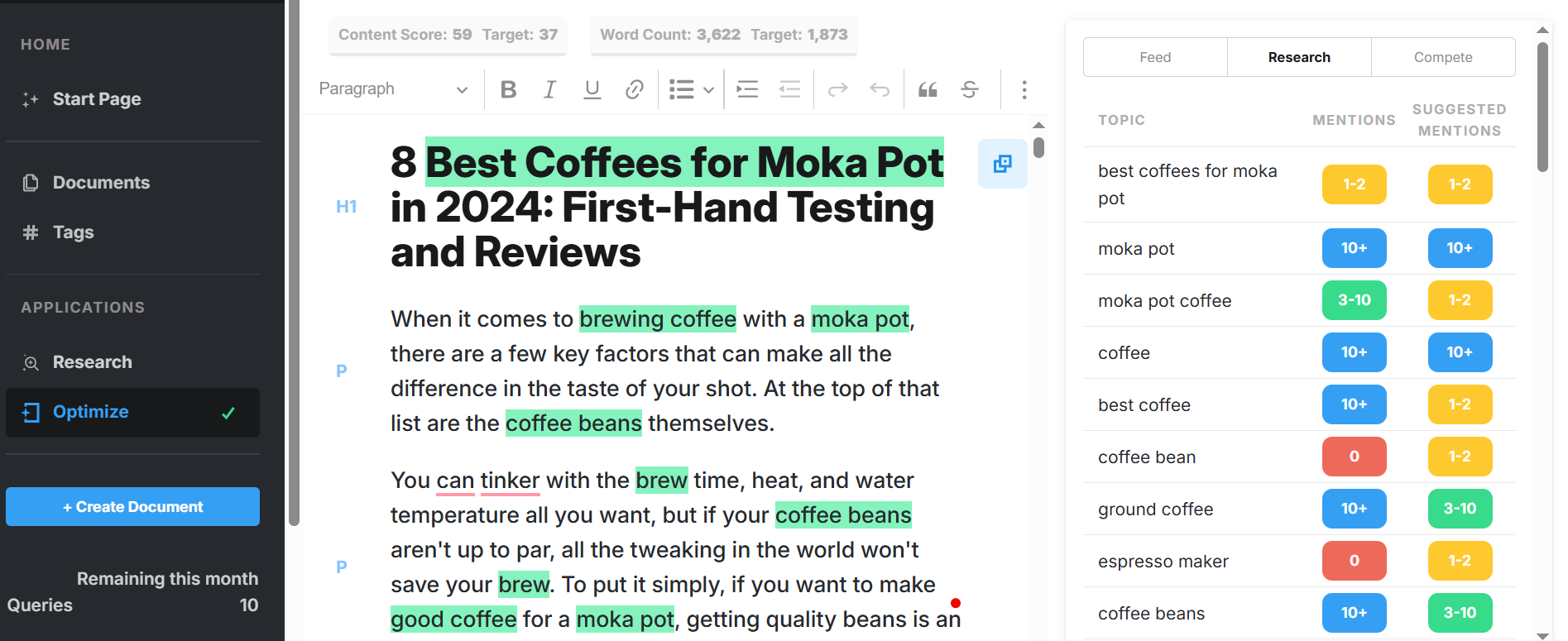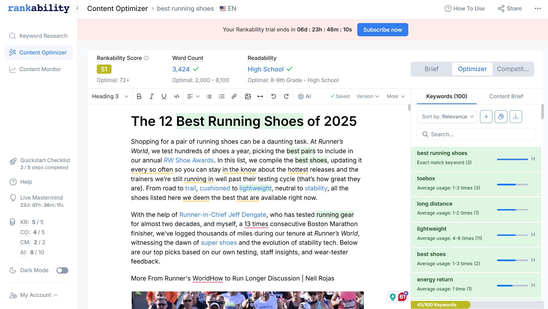 You can have the AI draft the SEO optimized content for you, or you can do it manually. The content optimizer provides suggestions on which keywords to include and gives you a Rankability Score.