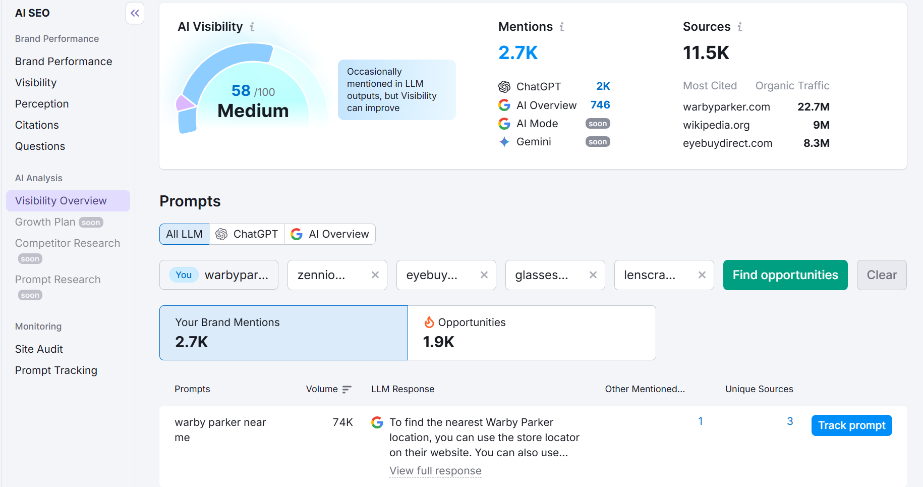 You can also track competitors and other sources that show up alongside your pages. And to see how your brand appears on the top LLM platforms including ChatGPT, Perplexity and Google's AI answers.