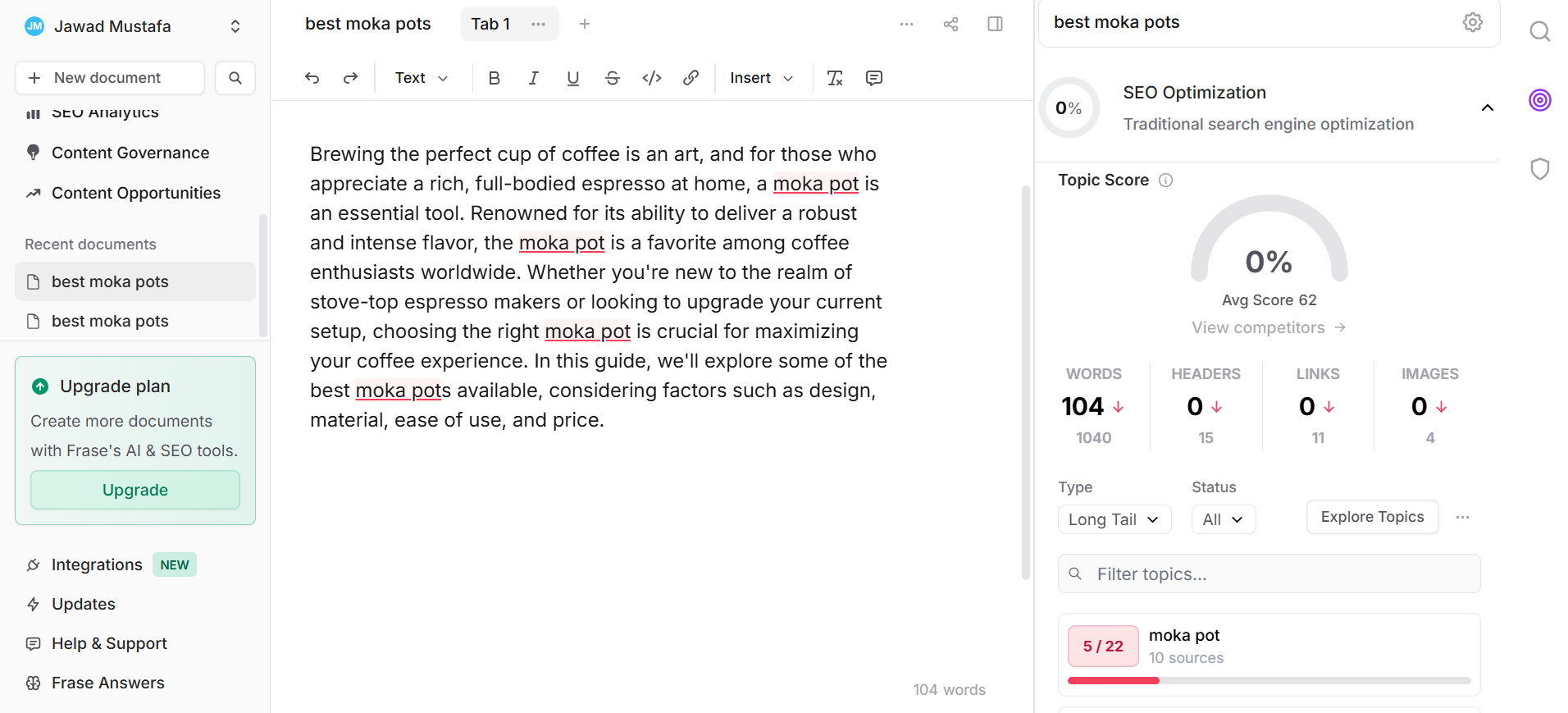 Frase is primarily a content optimization tool that also offers loads of other convenient AI SEO features.
