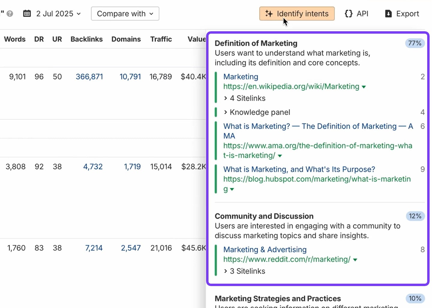 With keyword research, you can describe your website's niche and the audience you're targeting. Ahrefs' AI will then generate a list of keyword ideas along with their associated metrics. When running a SERP analysis, you also get deeper insights into search intent and what readers are looking for in a page.